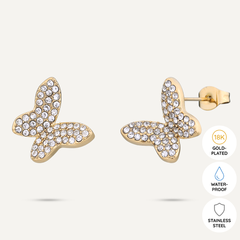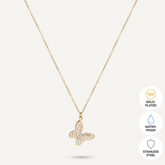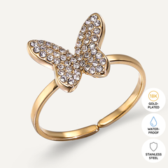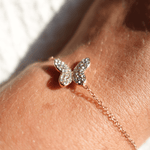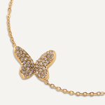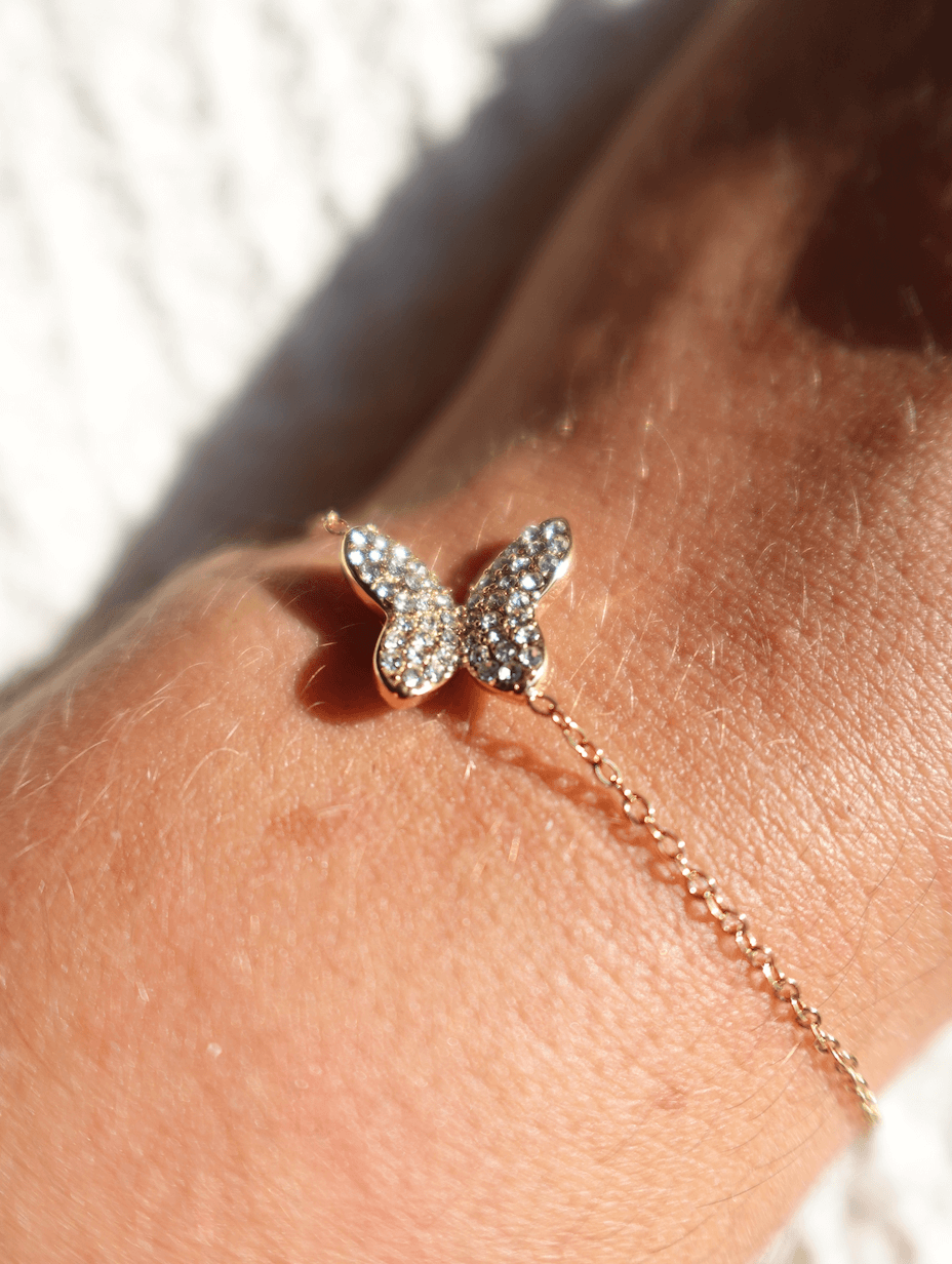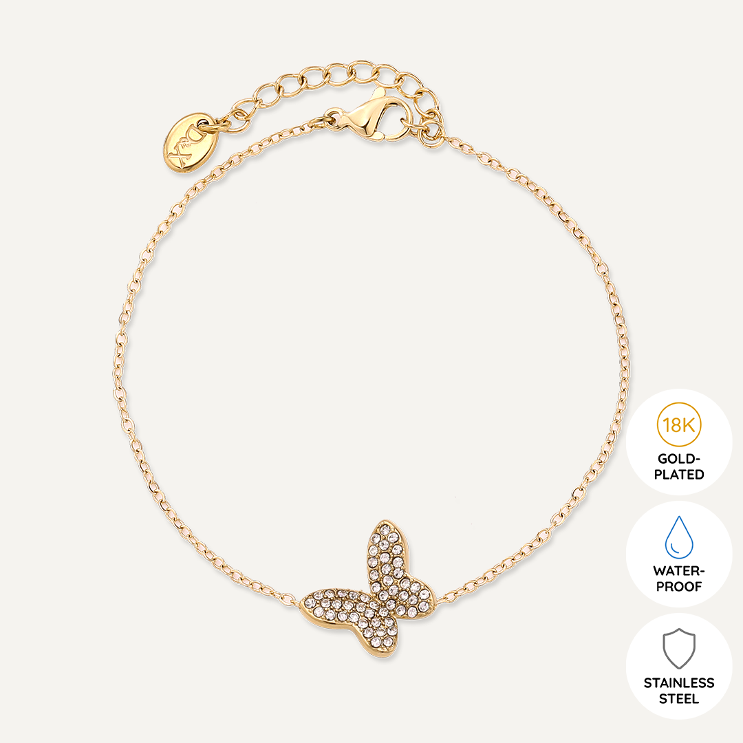This enchanting piece features a delicate butterfly charm encrusted with shimmering crystals, symbolizing change and elegance. The fine chain, crafted from 18K gold-plated material, is both water-proof and tarnish-free, ensuring it remains a radiant addition to your collection. With an adjustable clasp, this bracelet offers a perfect fit, making it an ideal accessory for any occasion, whether worn solo or layered with other pieces.