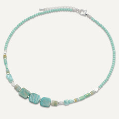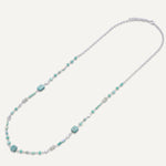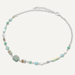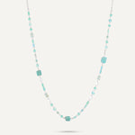 Featuring a delicate medley of aqua-hued semi‑precious stones, iridescent beads, and silver accents, this long necklace offers a fresh, ocean-inspired look. Its lightweight design and soft shimmer make it perfect for layering or wearing solo for a touch of natural elegance.