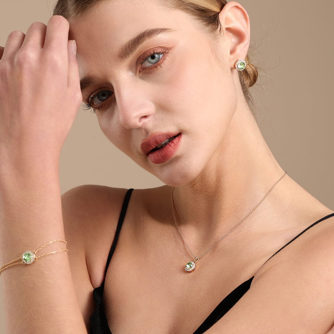 Eye-catching and elegant, this sparkling necklace and earring set is a perfect, considerate gift for that special someone. Featuring several intricate geometric designs of a birthstone-coloured gem framed by smaller cubic zirconia stones, this piece makes for an impactful, stylish statement regarding the importance of the wearer's symbolic birthstone. Show how much you care, and how much they mean to you with this thoughtful piece. As the August birthstone, Peridot is worn to encourage protection from evil and exhaustion. This product is also available as a matching bracelet.