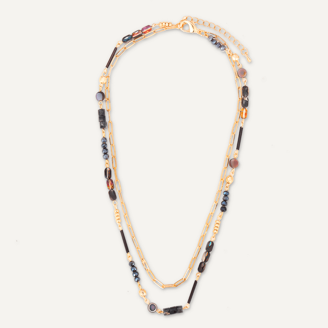 Black Semi-Precious Stone Short Multi-Row Necklace In Gold-Tone