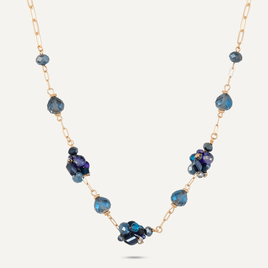 This short necklace features clusters of blue crystals on a delicate gold-tone chain.