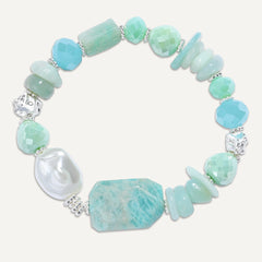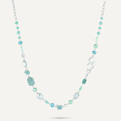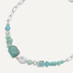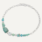 Make a powerful impression with this striking necklace, combining chunky aqua-toned semi‑precious stones, iridescent beads, and freshwater pearls. Anchored by oversized silver-toned chain links, this piece blends organic beauty with bold modern style—perfect for elevating both casual and formal looks.