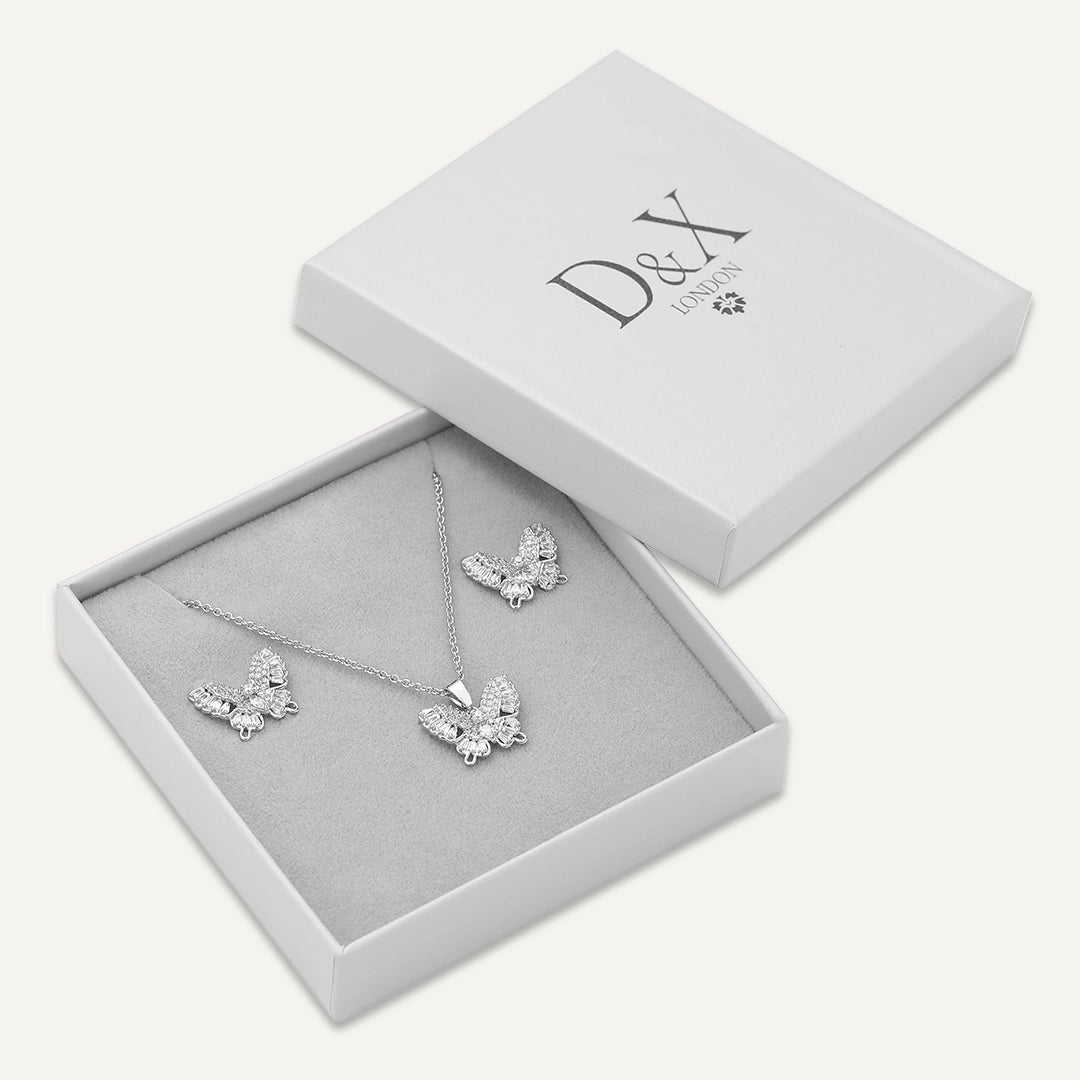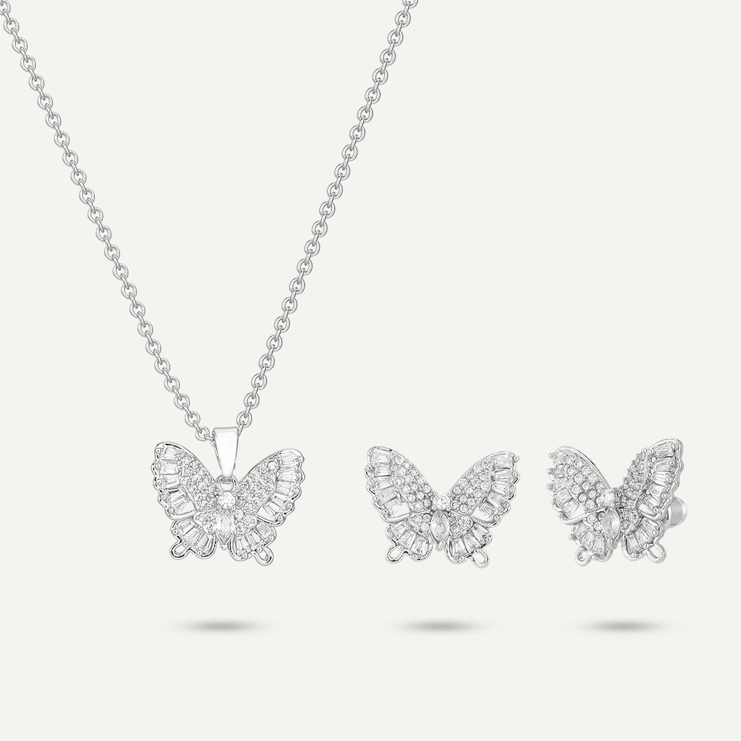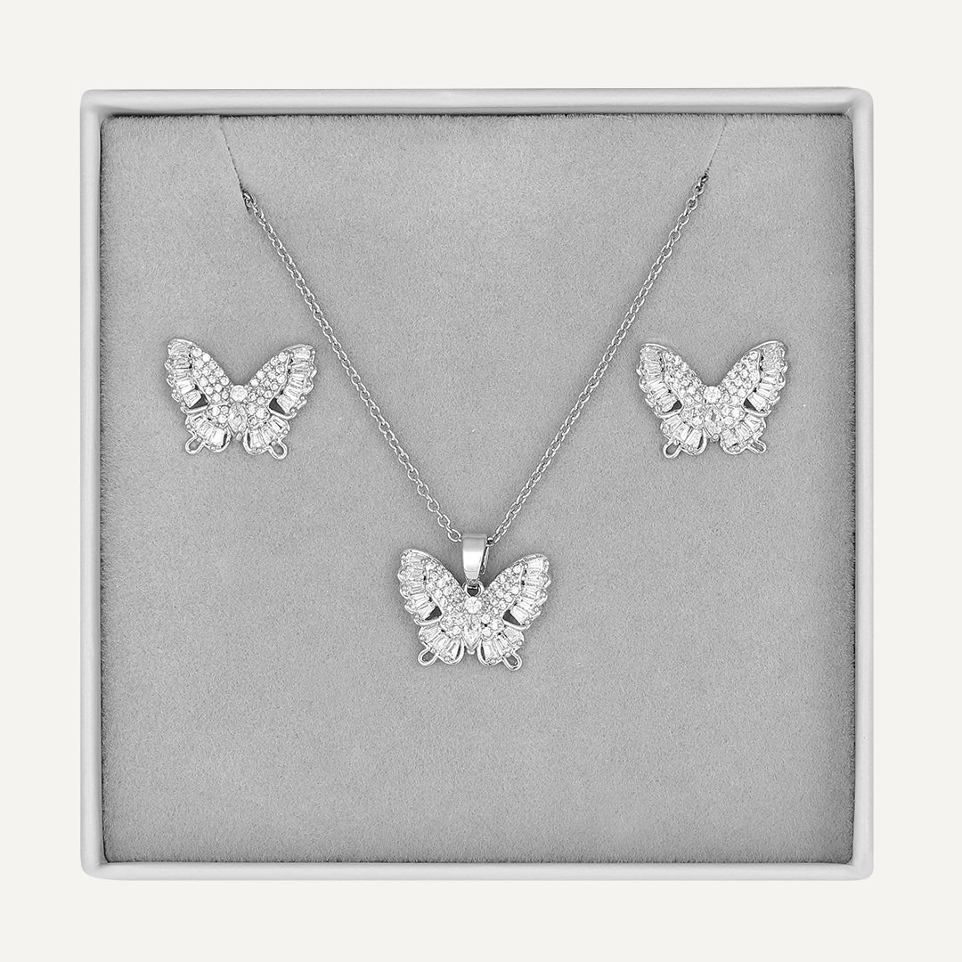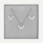 Each butterfly pendant and earring features intricately placed crystals that shimmer with every movement, creating a refined sparkle reminiscent of a butterfly’s wings in sunlight. Set in a silver-tone finish, this necklace and earring combination adds a touch of elegance and whimsy to any outfit.