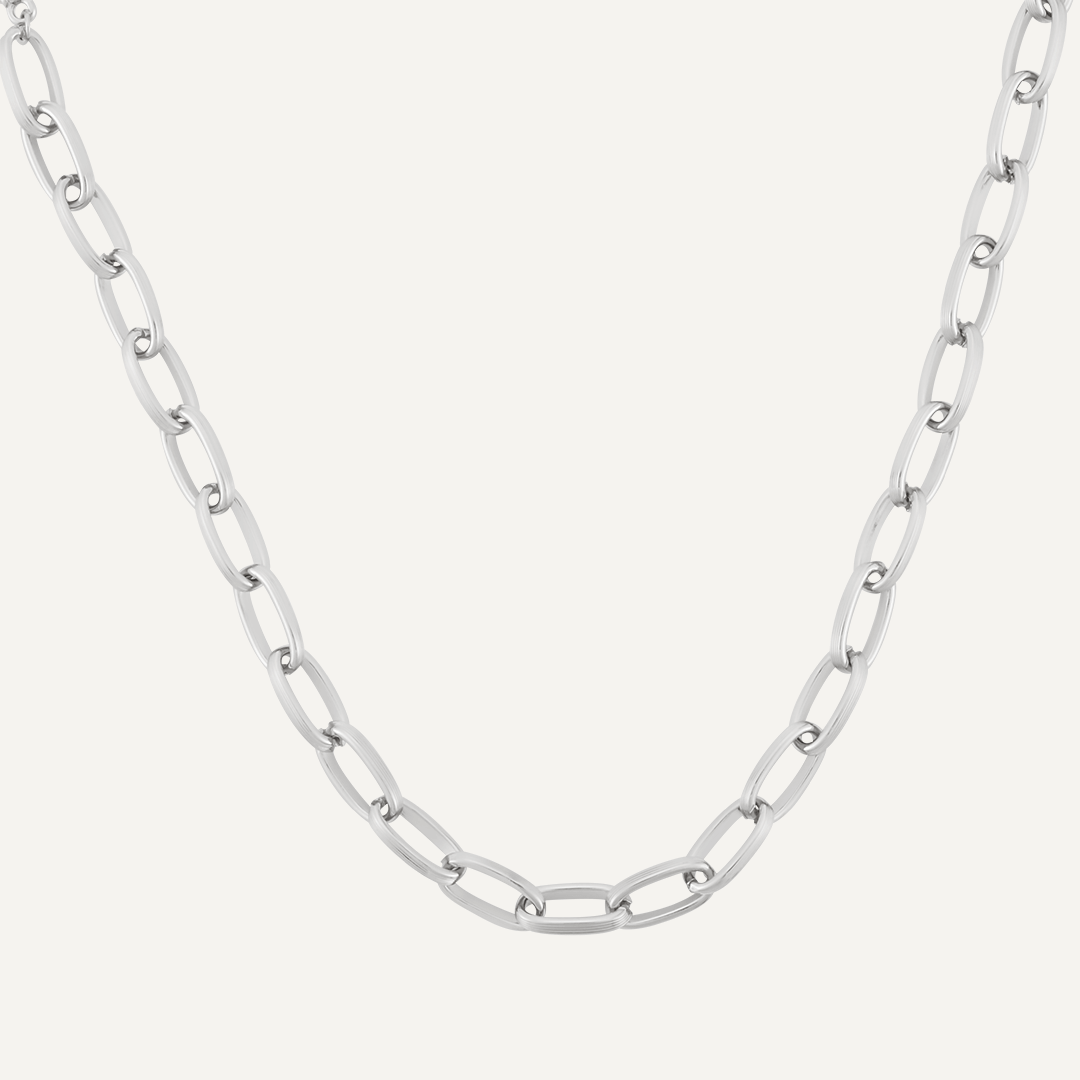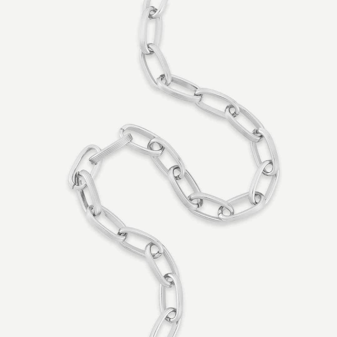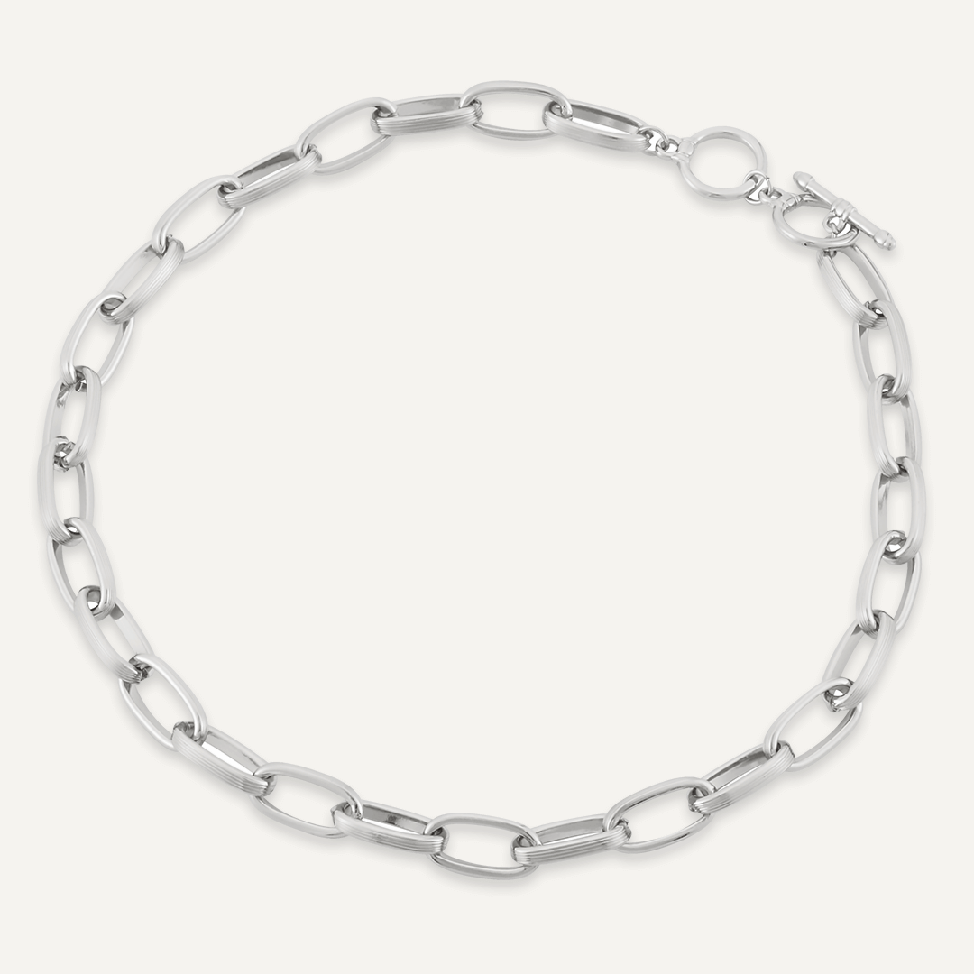 Our Necklace with a T-Bar chain-link in rhodium plating is the epitome of elegance. This stunning piece combines modern design with a classic touch, making it a versatile accessory for any occasion, from casual outings to sophisticated events.