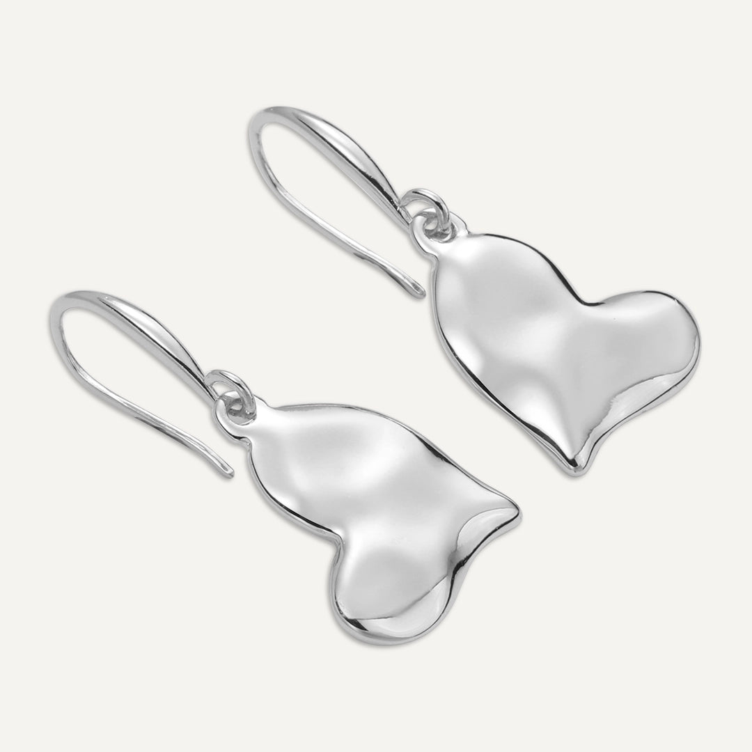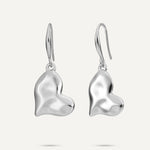 Silver-tone drop heart earrings featuring a modern, asymmetrical heart design with a smooth polish finish. The sculpted hearts hang elegantly from slim hooks, adding a touch of sophistication and shine to any outfit, perfect for both casual and formal occasions