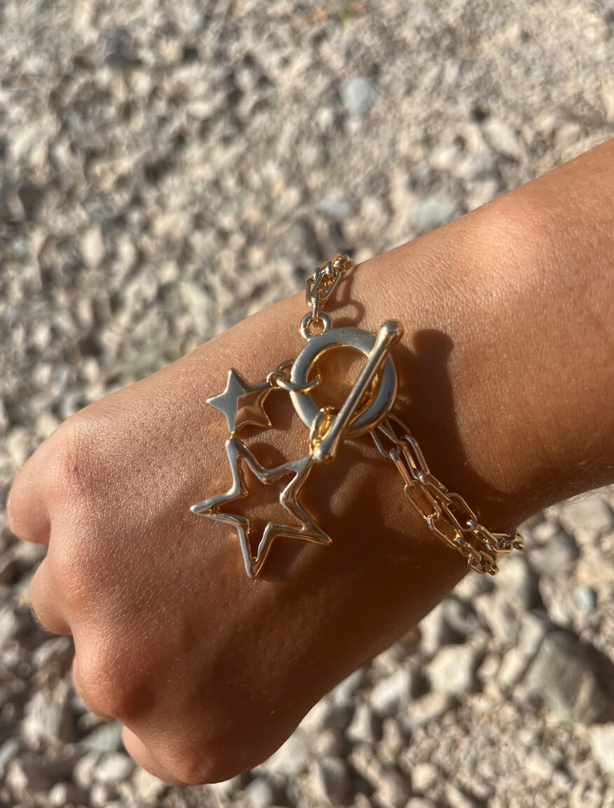 This double-chain bracelet features two stunning star pendants. Great for everyday wear or to take into the evening when going out.