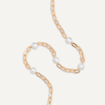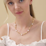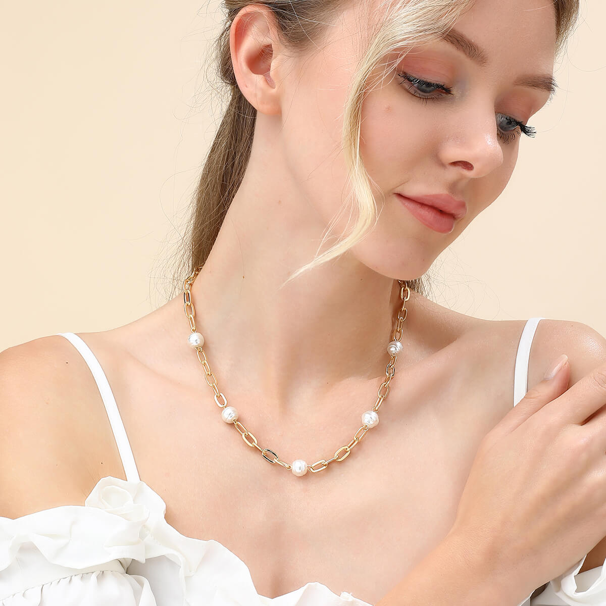 This elegant necklace features stunning faux pearls on a short gold-tone chain.