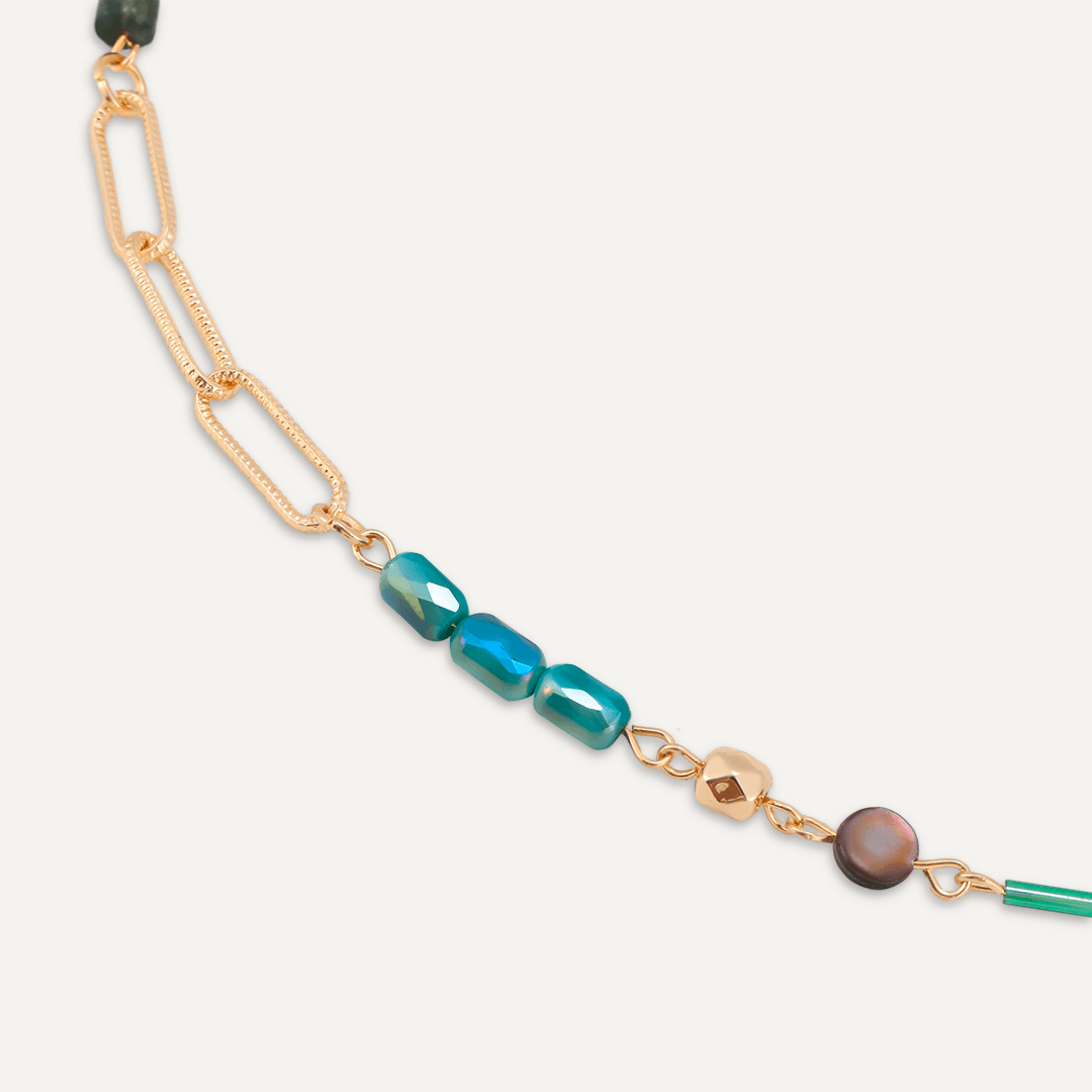 Featuring green stones and crystals on a delicate gold-tone chain, this necklace adds charm to any outfit.