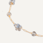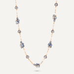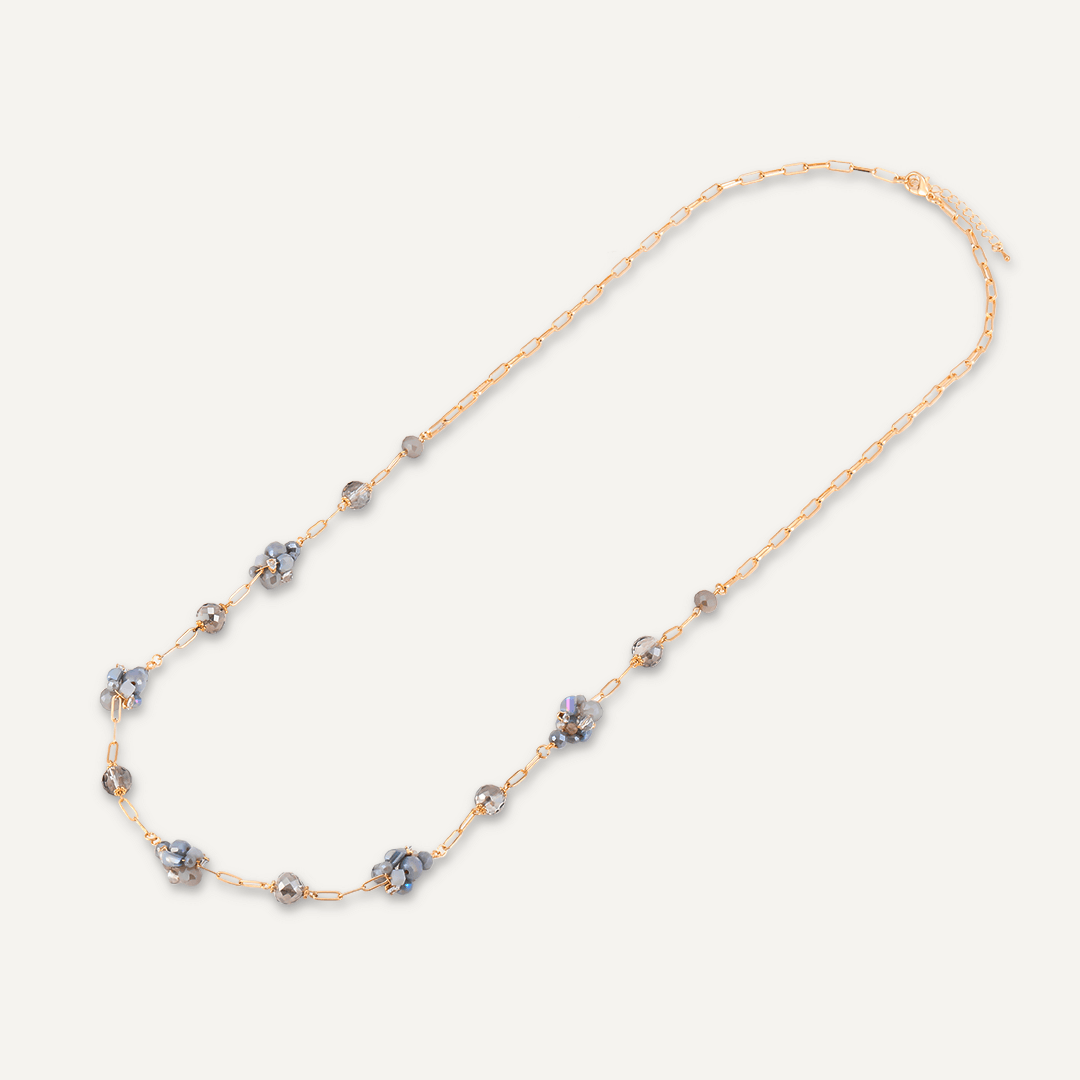 This long necklace features clusters of grey crystals on a delicate long chain.
