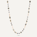 The perfect mix of creative and natural. This long semi-precious stone necklace mixes a variety of stones, pearls, and crystals with a gold-tone chain.