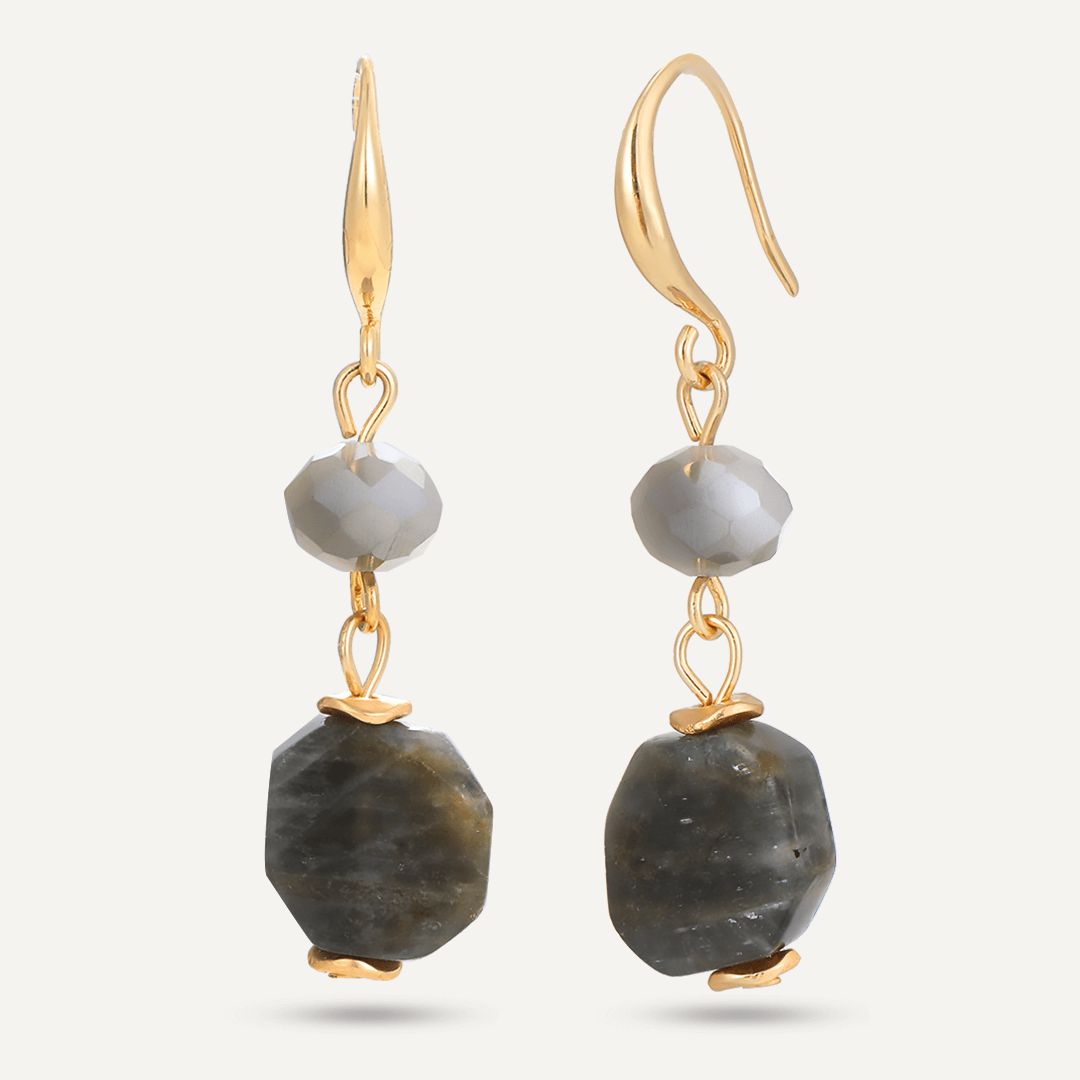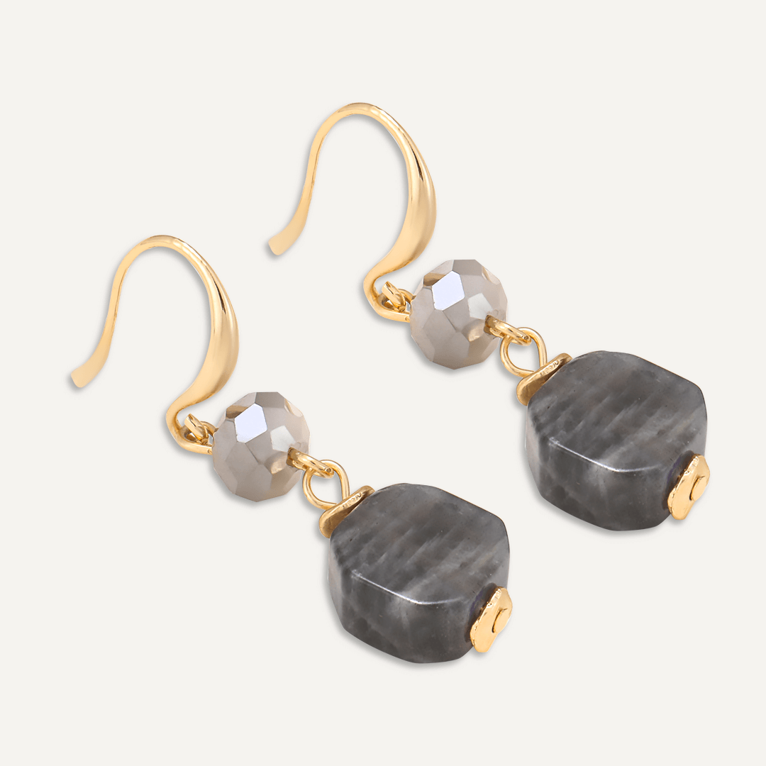 Featuring grey semi-precious stones and crystals, these earrings are sure to take your outfit to the next level!