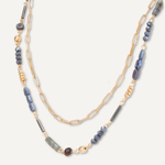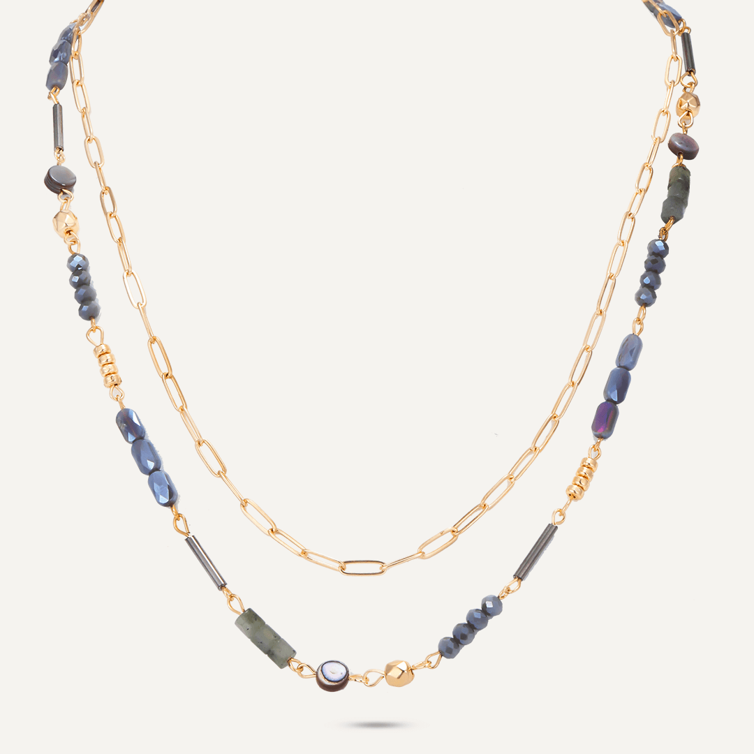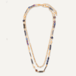 The perfect mix of creative and natural. This short semi-precious stone necklace mixes a variety of stones and crystals on two gold-tone chains.
