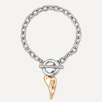 This bold bracelet features a chunky silver-tone chain with a striking gold-tone heart tusk charm, creating a captivating contrast. The T-bar closure adds a touch of vintage elegance while making it easy to wear.