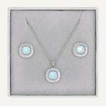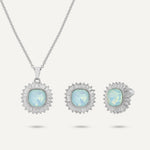 Features an iridescent stone framed by a halo of sparkling baguette and round crystals. The soft glow of the centerpiece shifts beautifully with every movement, showcasing hints of green and blue. Set in a sleek silver-tone finish, this necklace and earring pair adds a magical touch to any outfit.