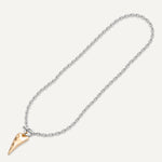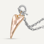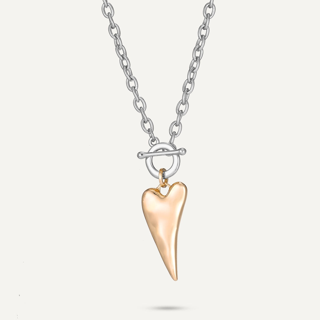 This elegant necklace features a unique two-tone design with a silver chain and a striking, elongated gold-tone heart pendant. The pendant’s modern, asymmetrical shape adds a chic twist, while the subtle contrast of silver and gold enhances its appeal. Finished with a convenient toggle clasp, this necklace is perfect for adding a touch of sophistication to any outfit.