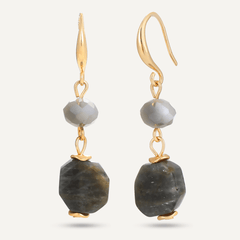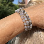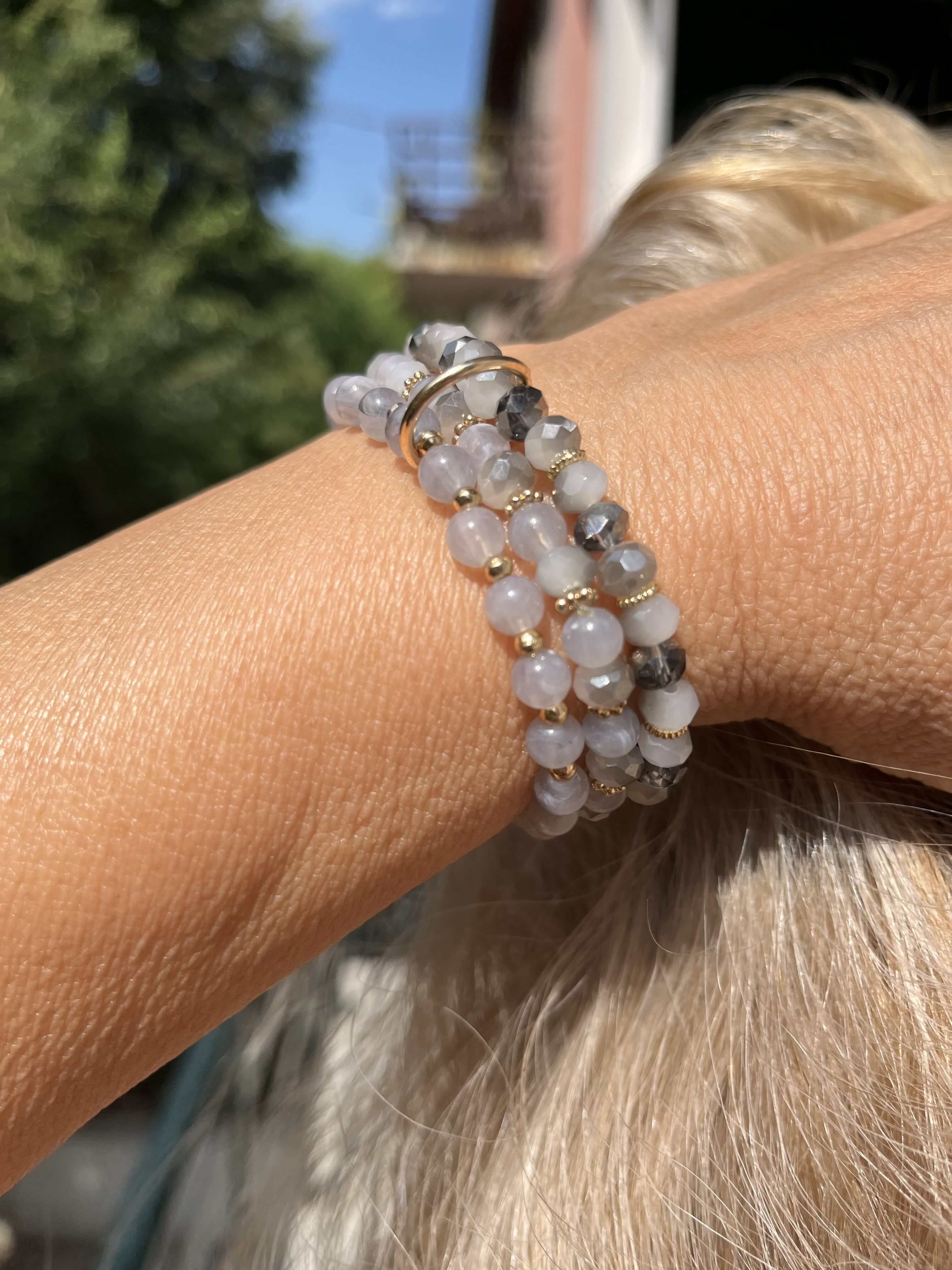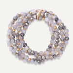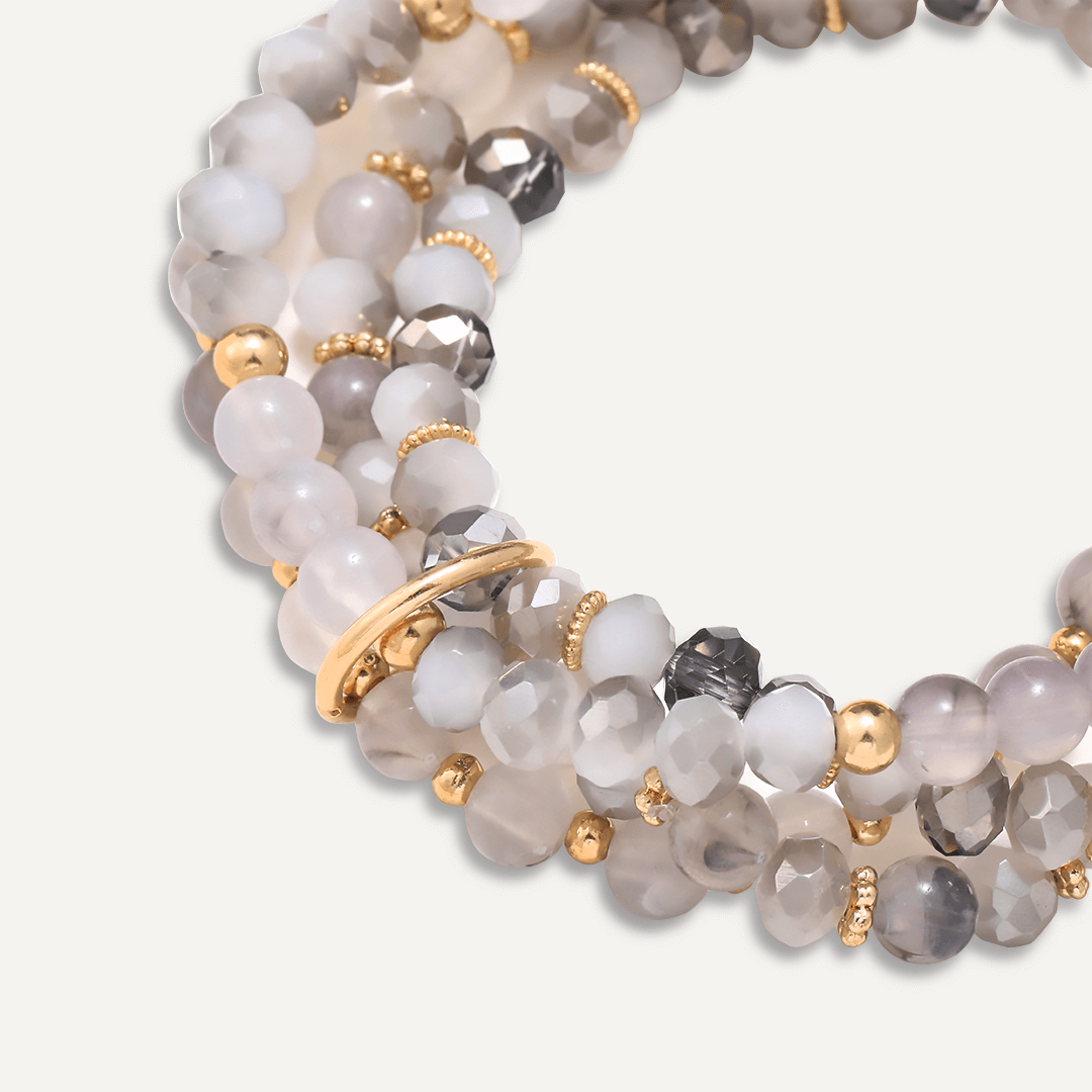 This multi-row bracelet set features stunning grey crystals and natural stones.