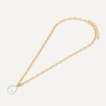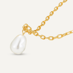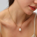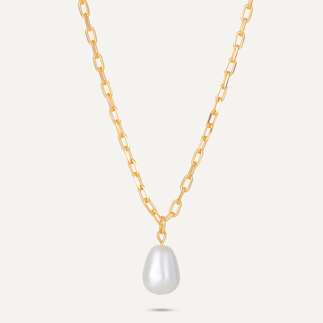 This elegant necklace features a stunning faux pearl pendant on a short gold-tone chain.