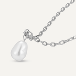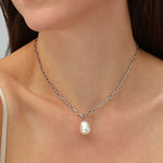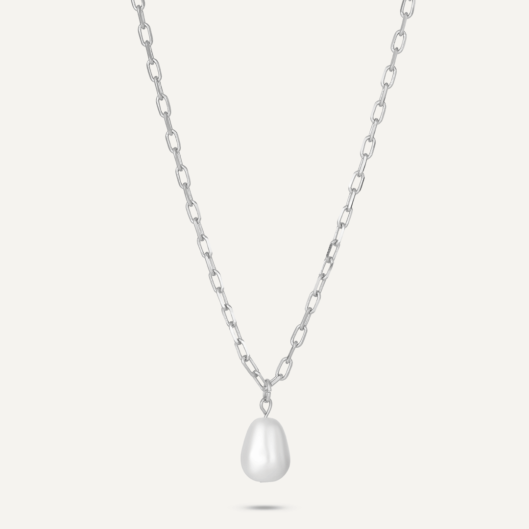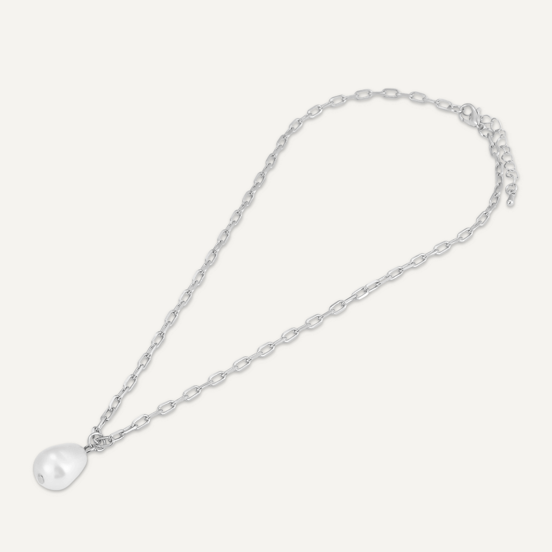 This elegant necklace features a stunning faux pearl pendant on a short rhodium chain.