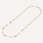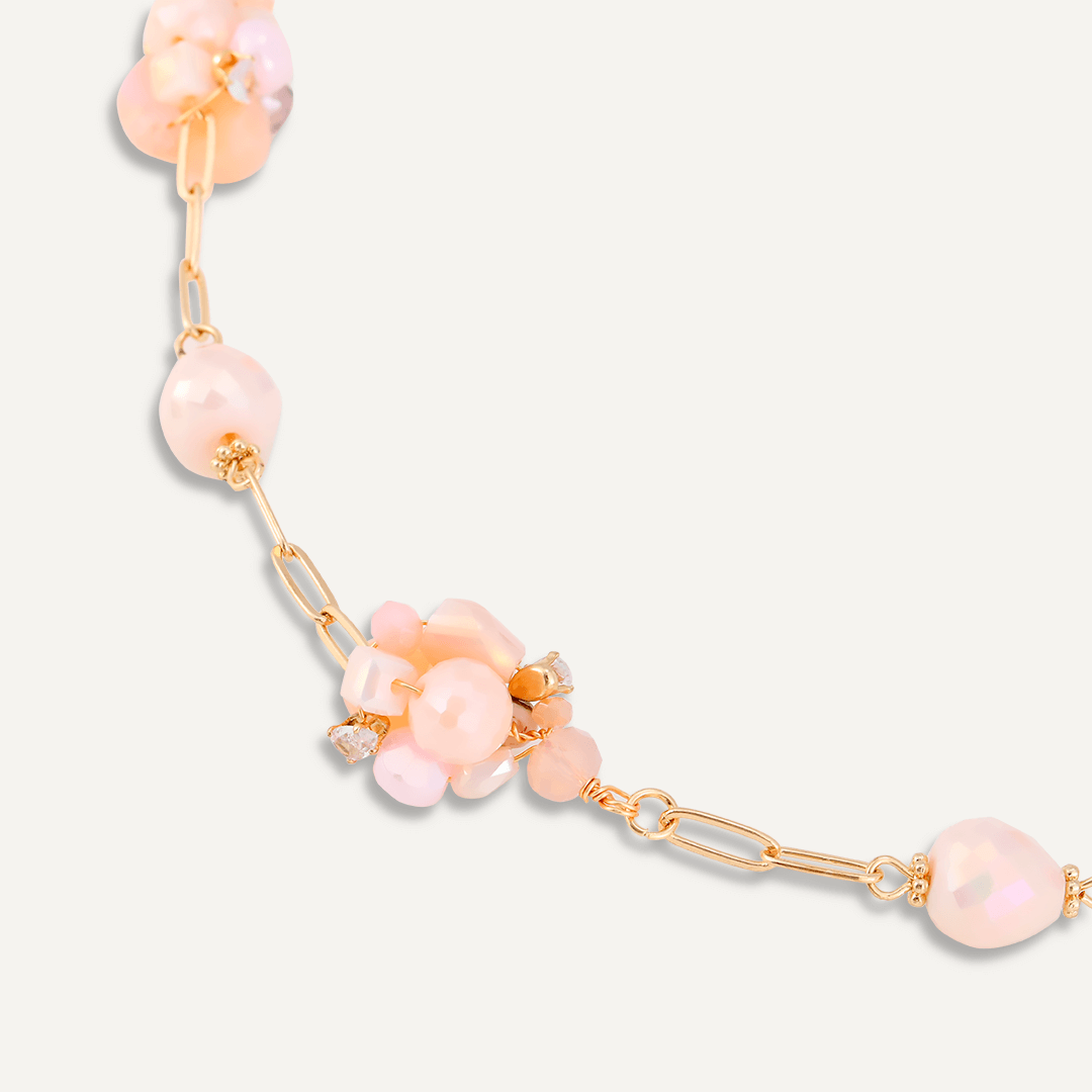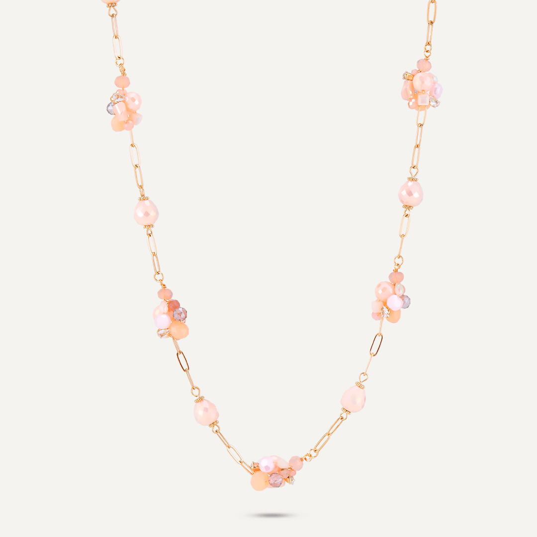 This long necklace features clusters of pink crystals on a delicate long chain.