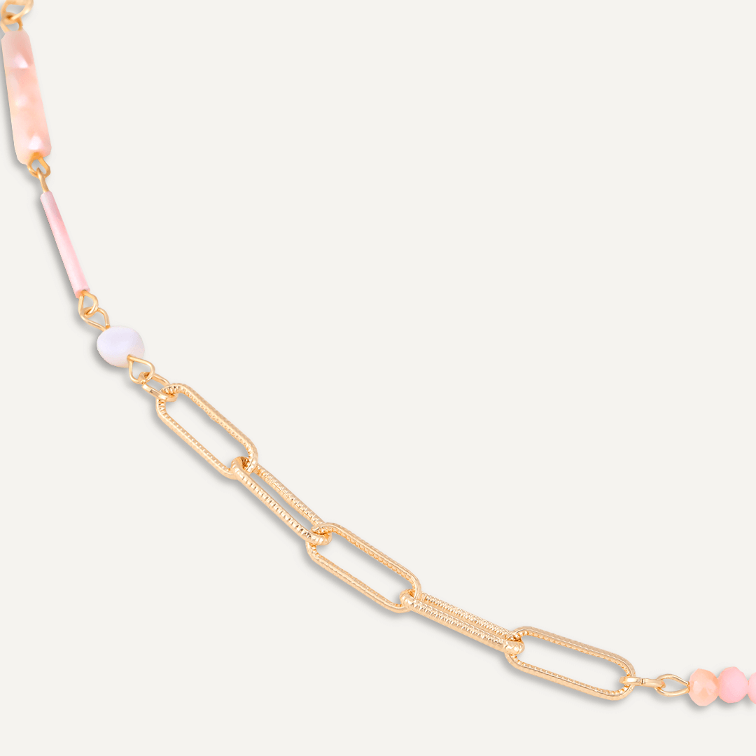 Featuring pink stones and crystals on a delicate gold-tone chain, this necklace adds charm to any outfit.