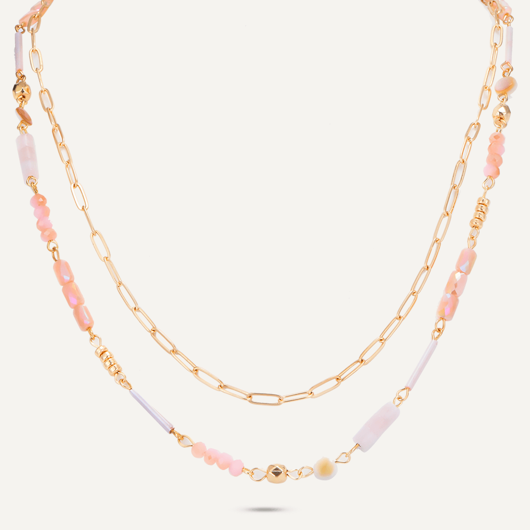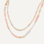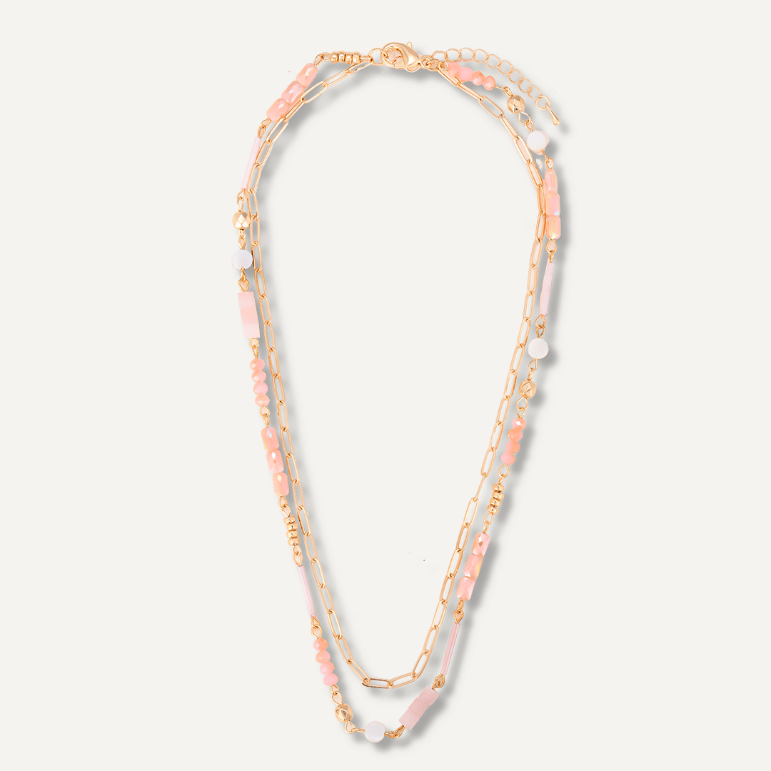 Pink Semi-Precious Stone Short Multi-Row Necklace In Gold-Tone
