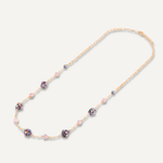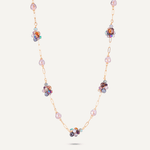 This long necklace features clusters of purple crystals on a delicate long chain.