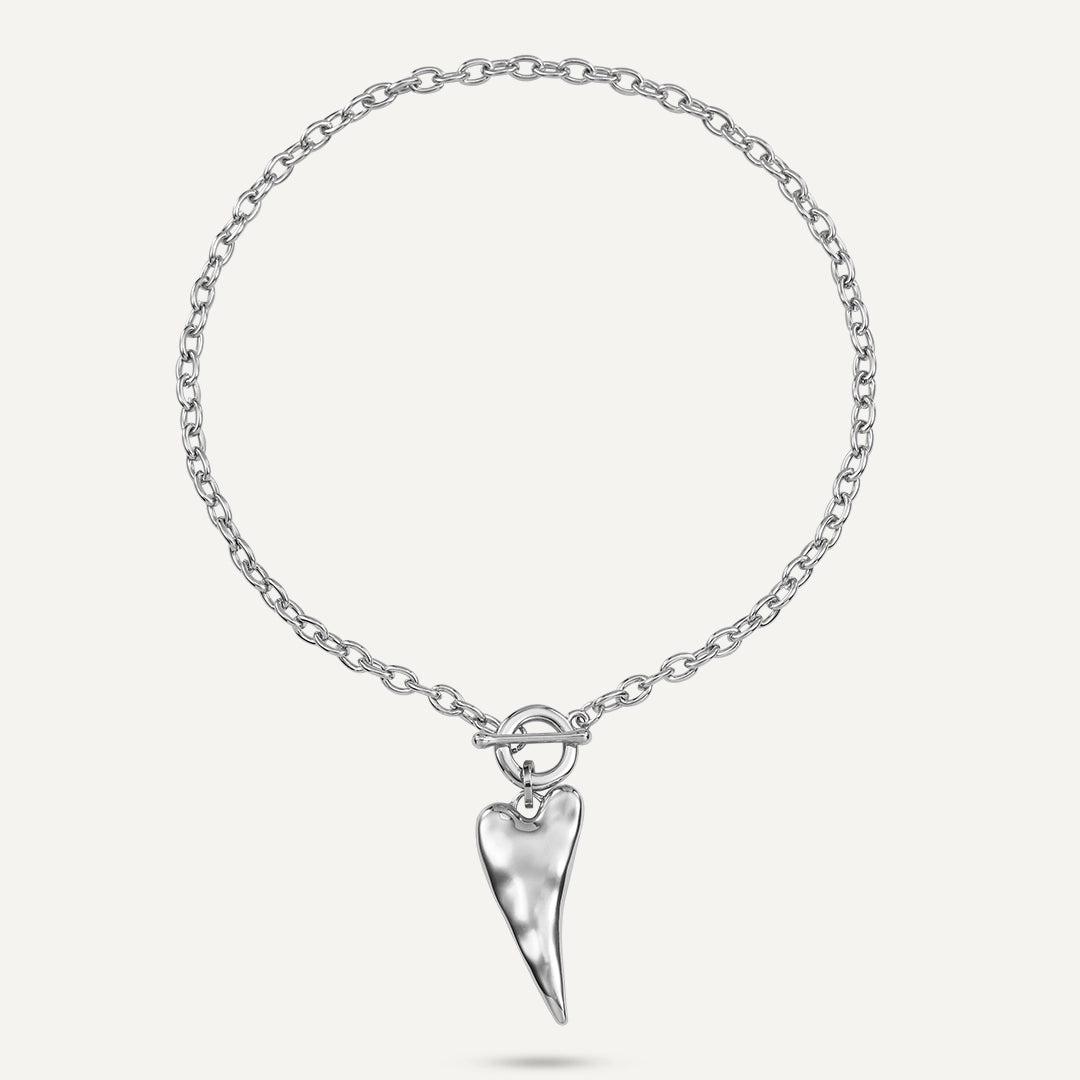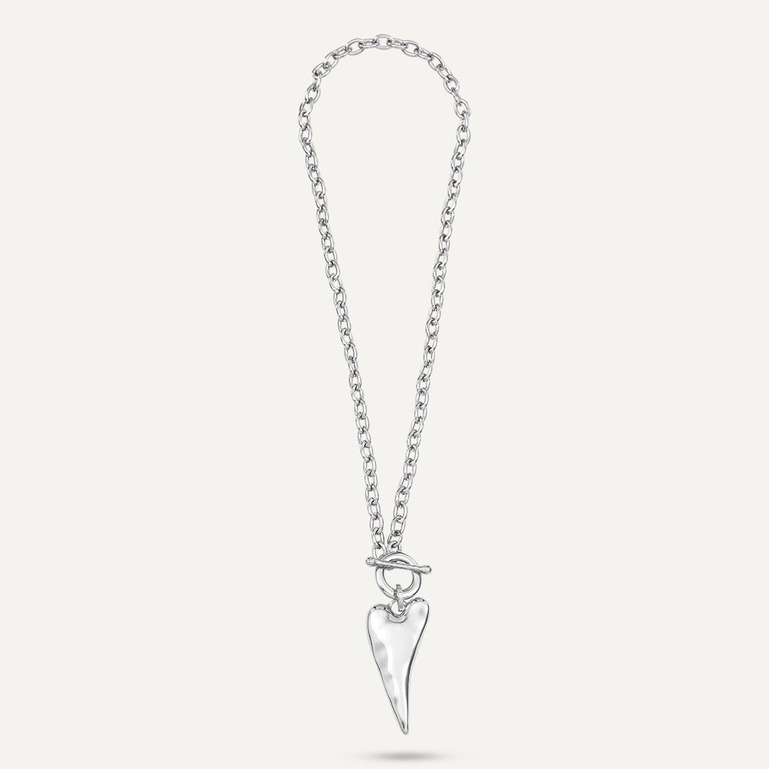This stylish necklace showcases a beautifully crafted silver-tone chain paired with an elongated, asymmetrical heart pendant, exuding contemporary elegance. The silver-tone finish gives it a luxurious feel, while the unique shape of the heart adds a modern edge. Fastened with a convenient toggle clasp, this necklace is perfect for both everyday wear and special occasions, bringing a touch of charm and sophistication to any outfit.