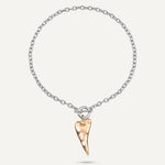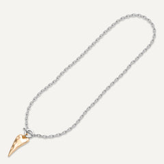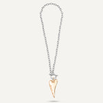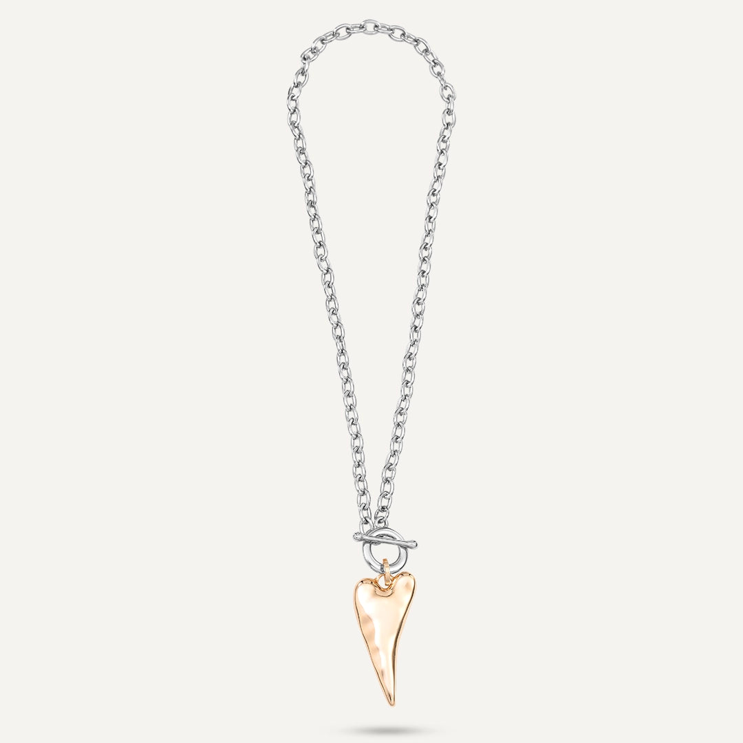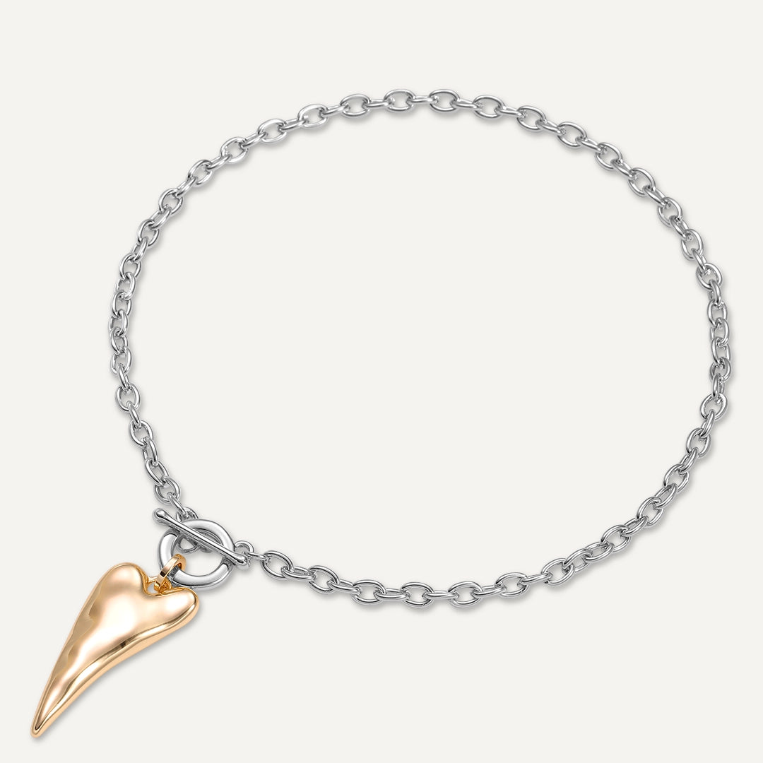 This elegant necklace features a unique two-tone design with a silver chain and a striking, elongated gold-tone heart pendant. The pendant’s modern, asymmetrical shape adds a chic twist, while the subtle contrast of silver and gold enhances its appeal. Finished with a convenient toggle clasp, this necklace is perfect for adding a touch of sophistication to any outfit.