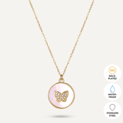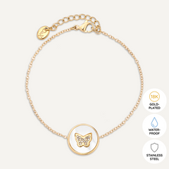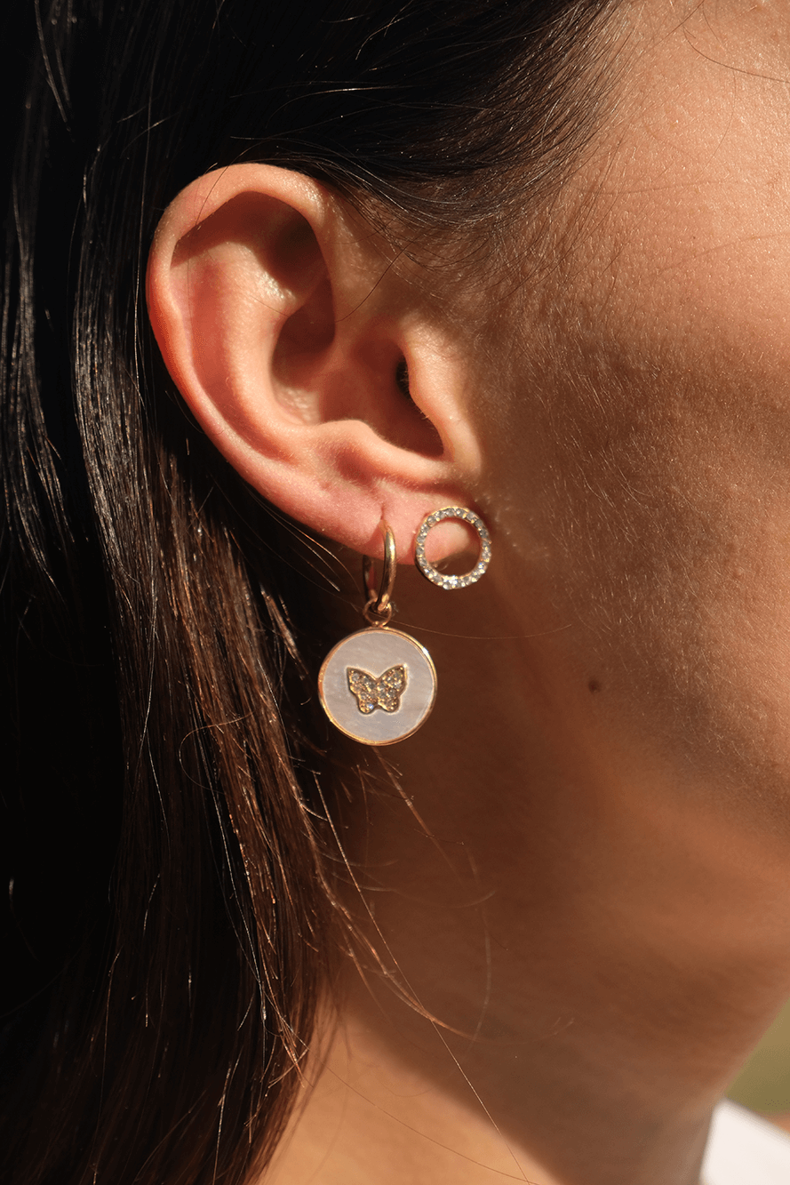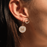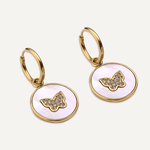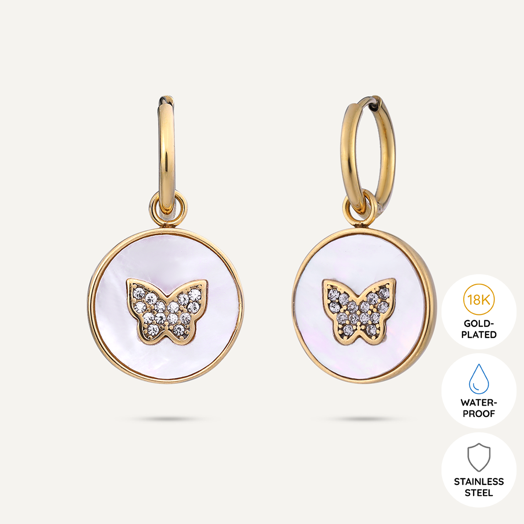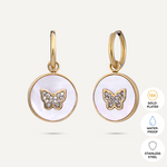 These earrings feature delicate butterfly motifs set within round gold frames, creating a dreamy and whimsical look. Crafted from 18K gold-plated stainless steel, they offer both beauty and durability, with a water-proof and tarnish-free finish.