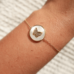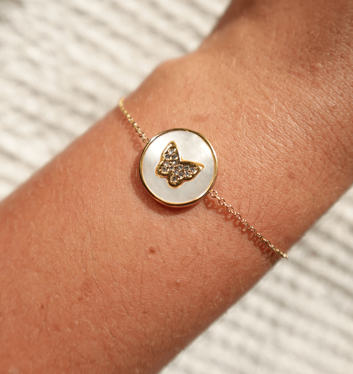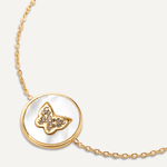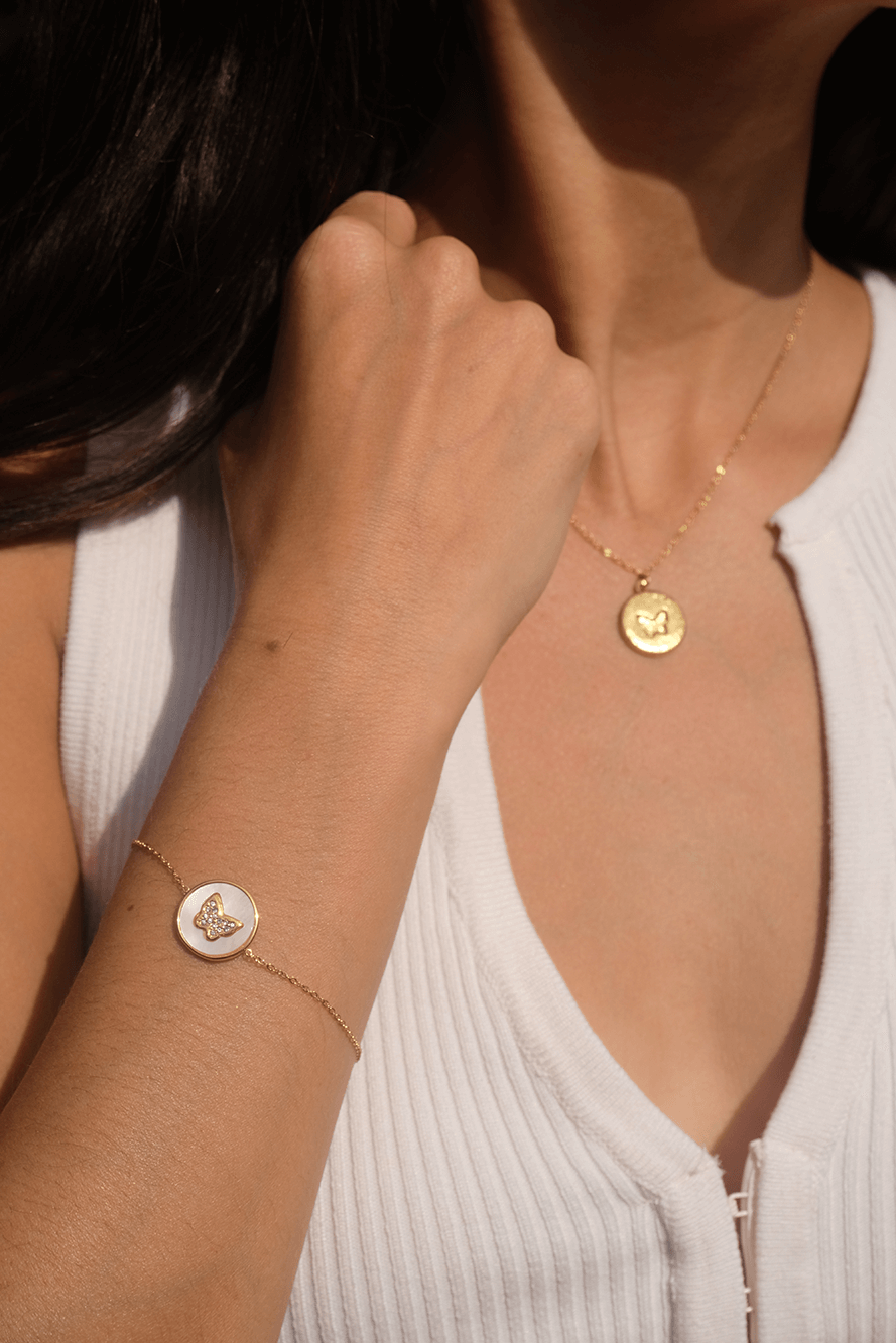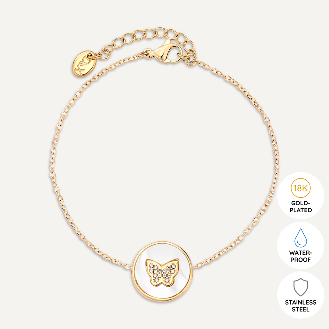 Flutter into elegance with the Vibes Butterfly Embrace Clasp Bracelet. This exquisite piece features a delicate gold-plated chain adorned with a circular charm, showcasing a sparkling butterfly motif set against a luminous backdrop. Crafted with 18K gold-plated material, this bracelet is water-proof, tarnish-free, and hypoallergenic. The adjustable clasp ensures a perfect fit, making it an ideal accessory for adding a touch of graceful beauty to any ensemble.