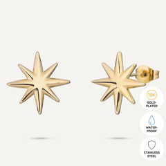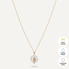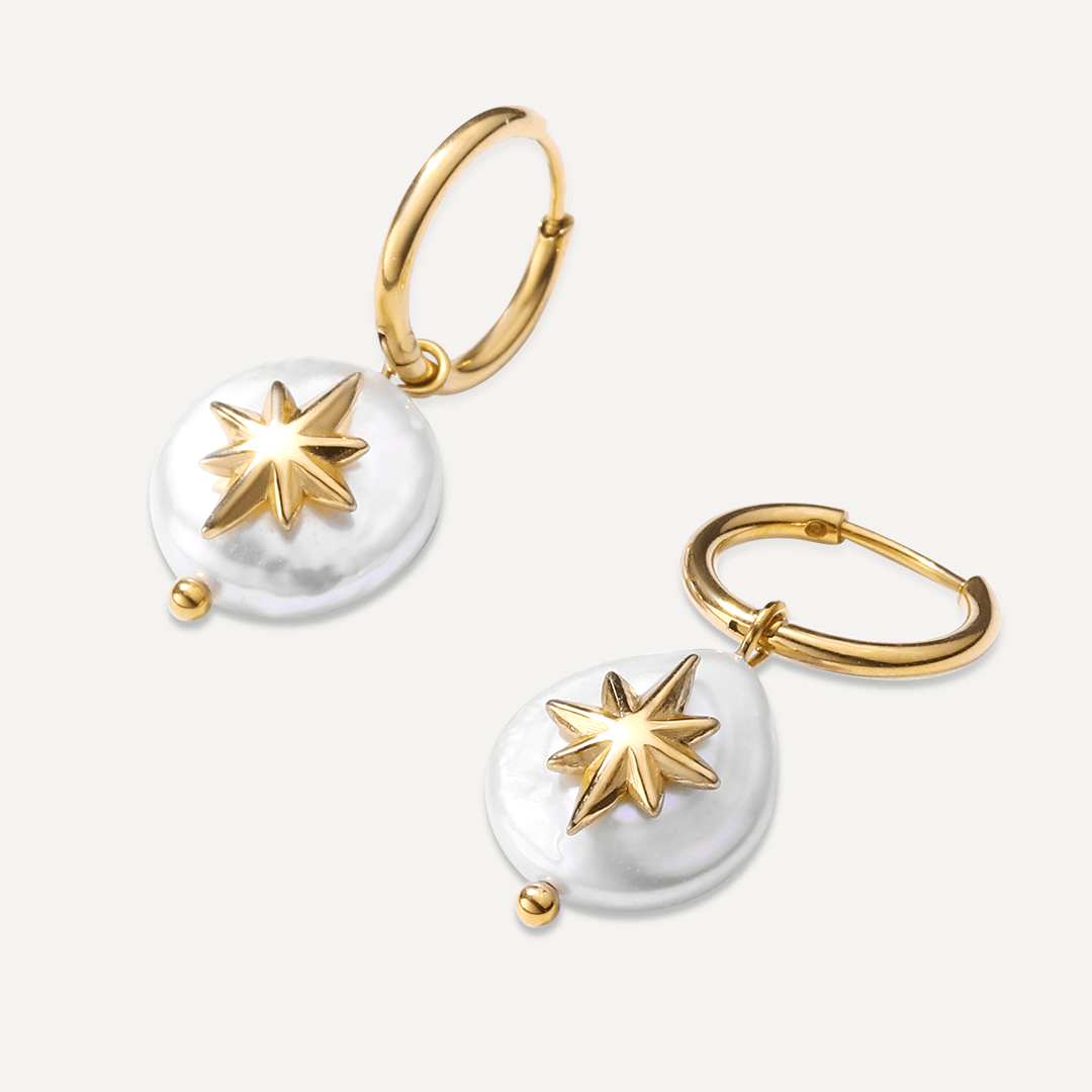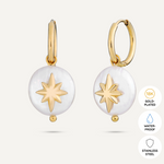 Featuring lustrous pearl discs adorned with gold star emblems, these earrings blend timeless sophistication with a hint of cosmic wonder. Suspended from sleek gold hoops, each earring is crafted from high-quality 18K gold-plated stainless steel, water-proof, and tarnish-free.