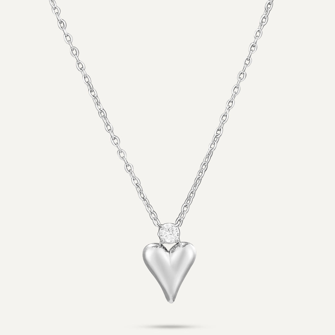 This elegant necklace features a petite white gold-plated heart pendant, accentuated by a sparkling crystal above it. Crafted from white gold-plated stainless steel, this necklace offers a delicate and refined touch to any outfit. Its minimalist design makes it versatile enough for everyday wear or special occasions.