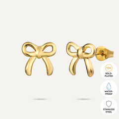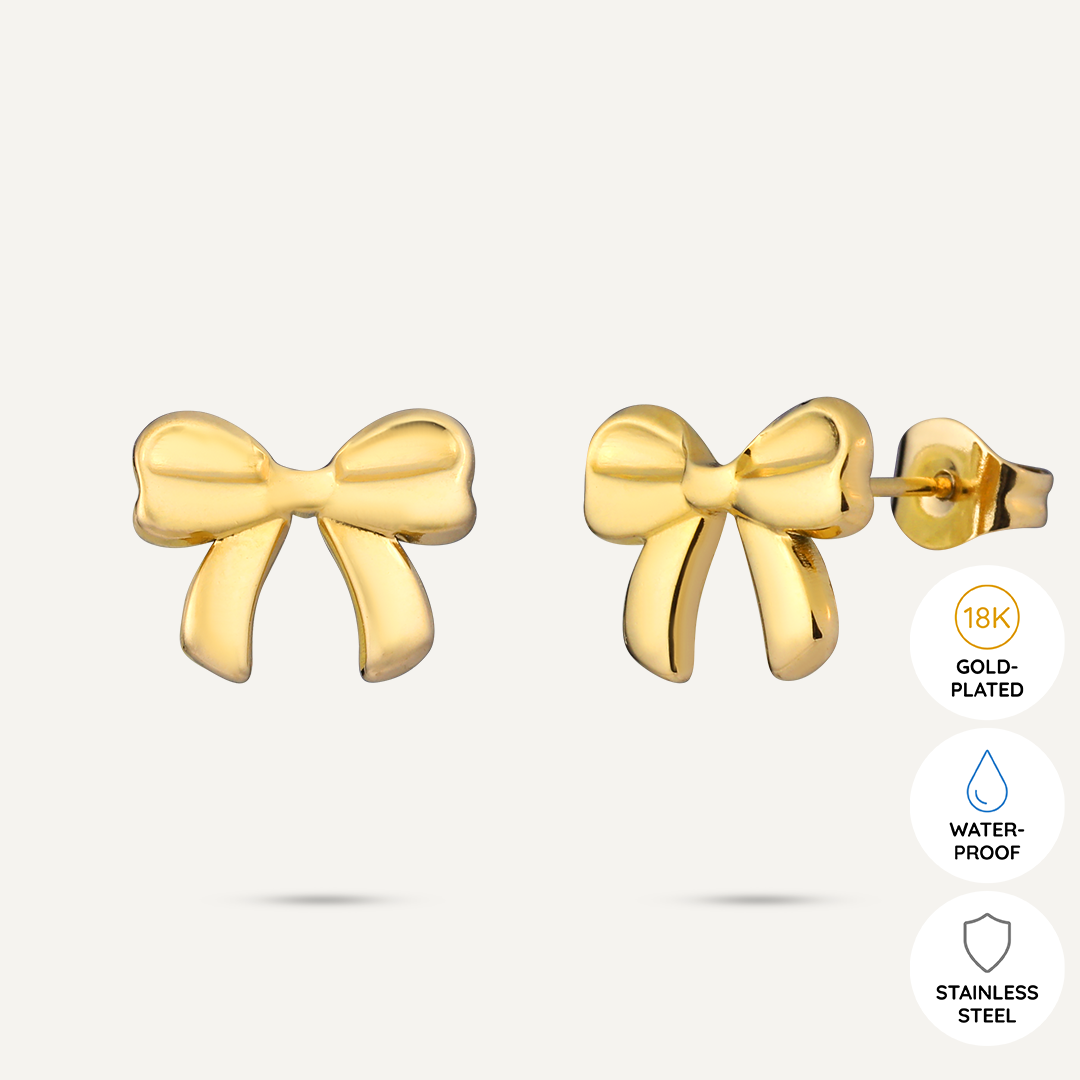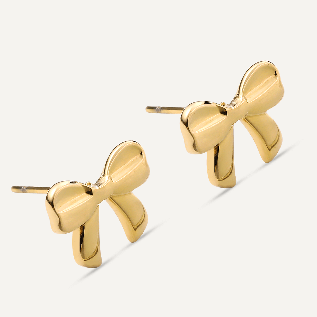 Crafted in 18K gold-plated stainless steel, these earrings are perfect for adding a charming accent to your everyday style. The delicate bow design symbolizes grace and femininity, making these earrings an ideal choice for a subtle yet impactful statement. These earrings are hypoallergenic, tarnish-resistant, and perfect for everyday wear.