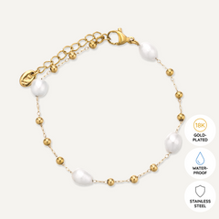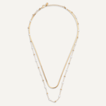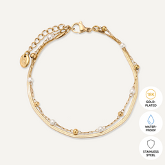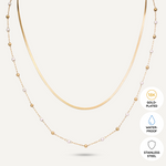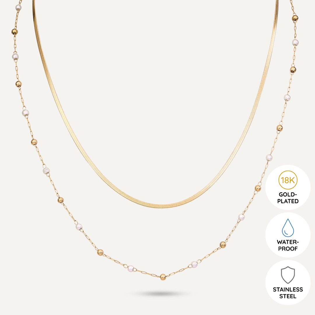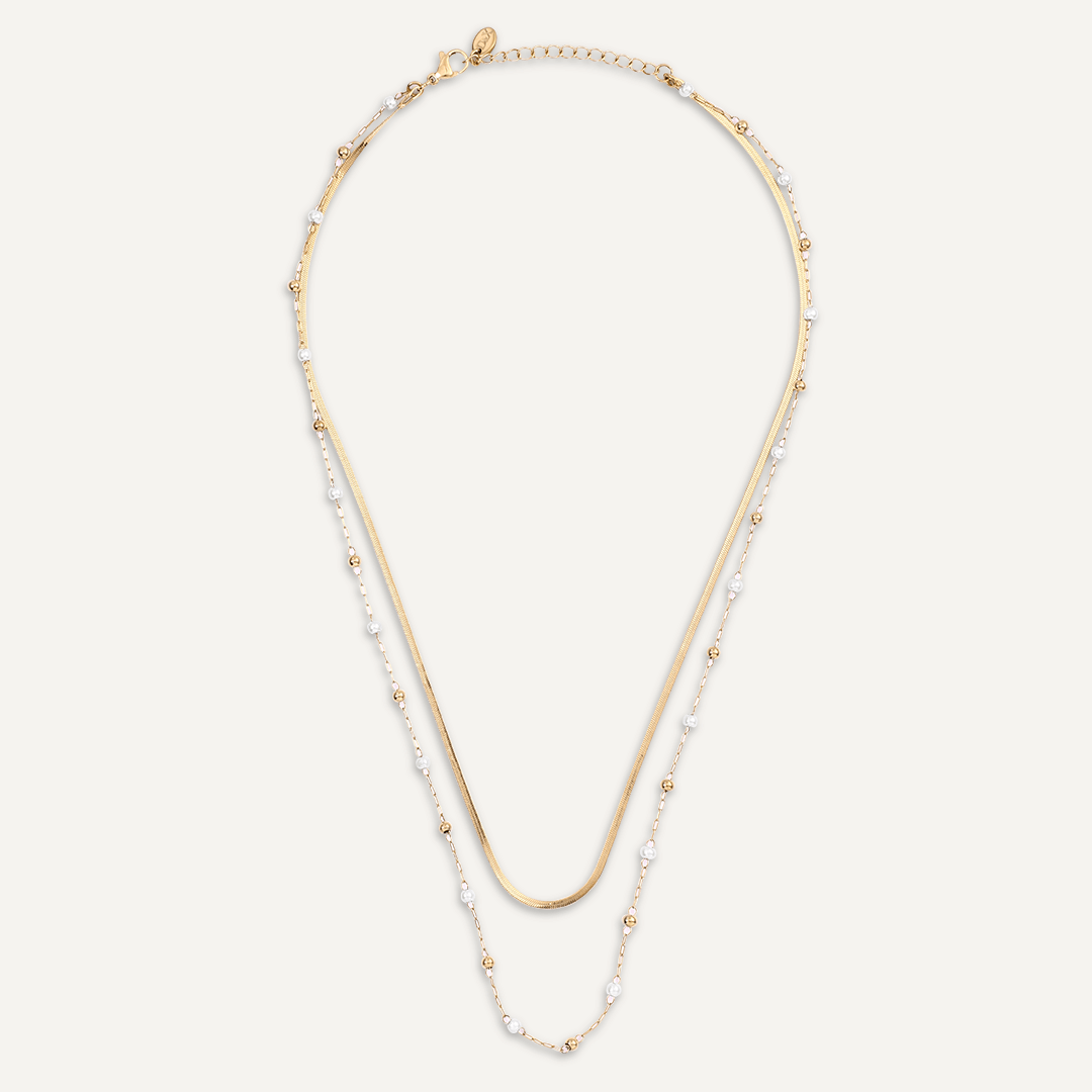 This exquisite piece features two distinct chains: a sleek gold snake chain and a delicate chain adorned with tiny pearls and gold beads. Crafted in 18K gold-plated stainless steel, this layered necklace offers a chic, modern look that’s perfect for any occasion.