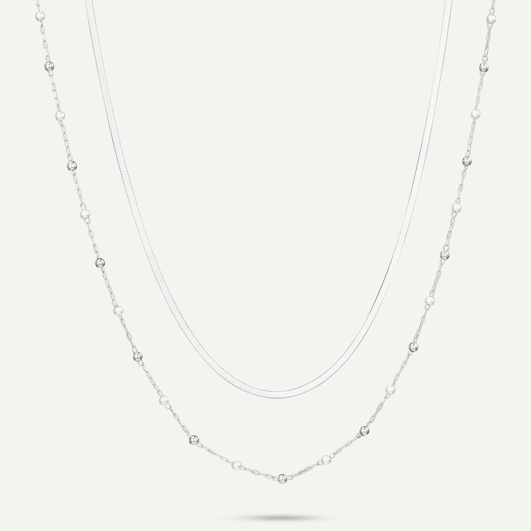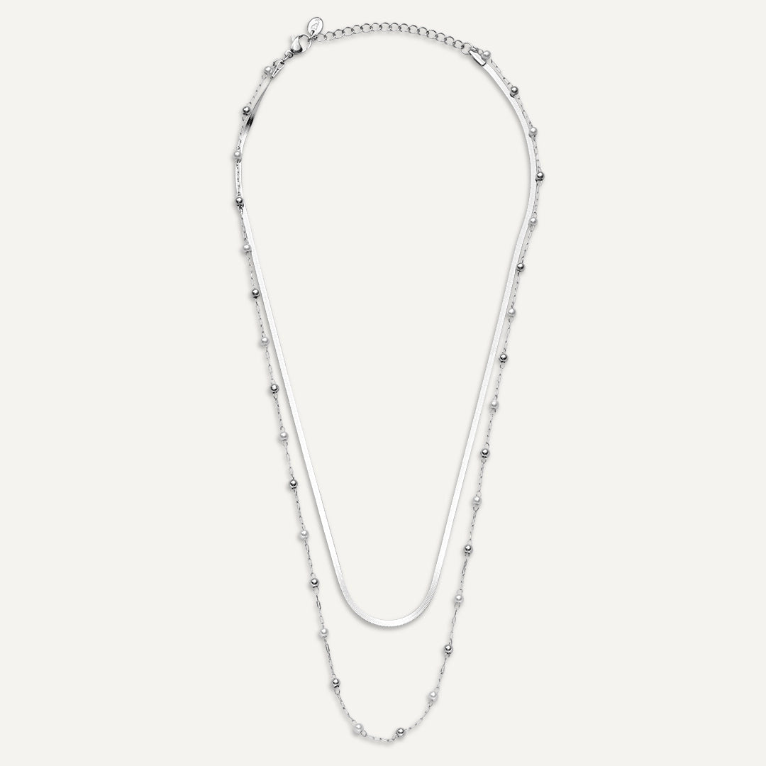This exquisite piece features two distinct chains: a sleek white gold snake chain and a delicate chain adorned with tiny pearls and white gold beads. Crafted in white gold-plated stainless steel, this layered necklace offers a chic, modern look that’s perfect for any occasion.