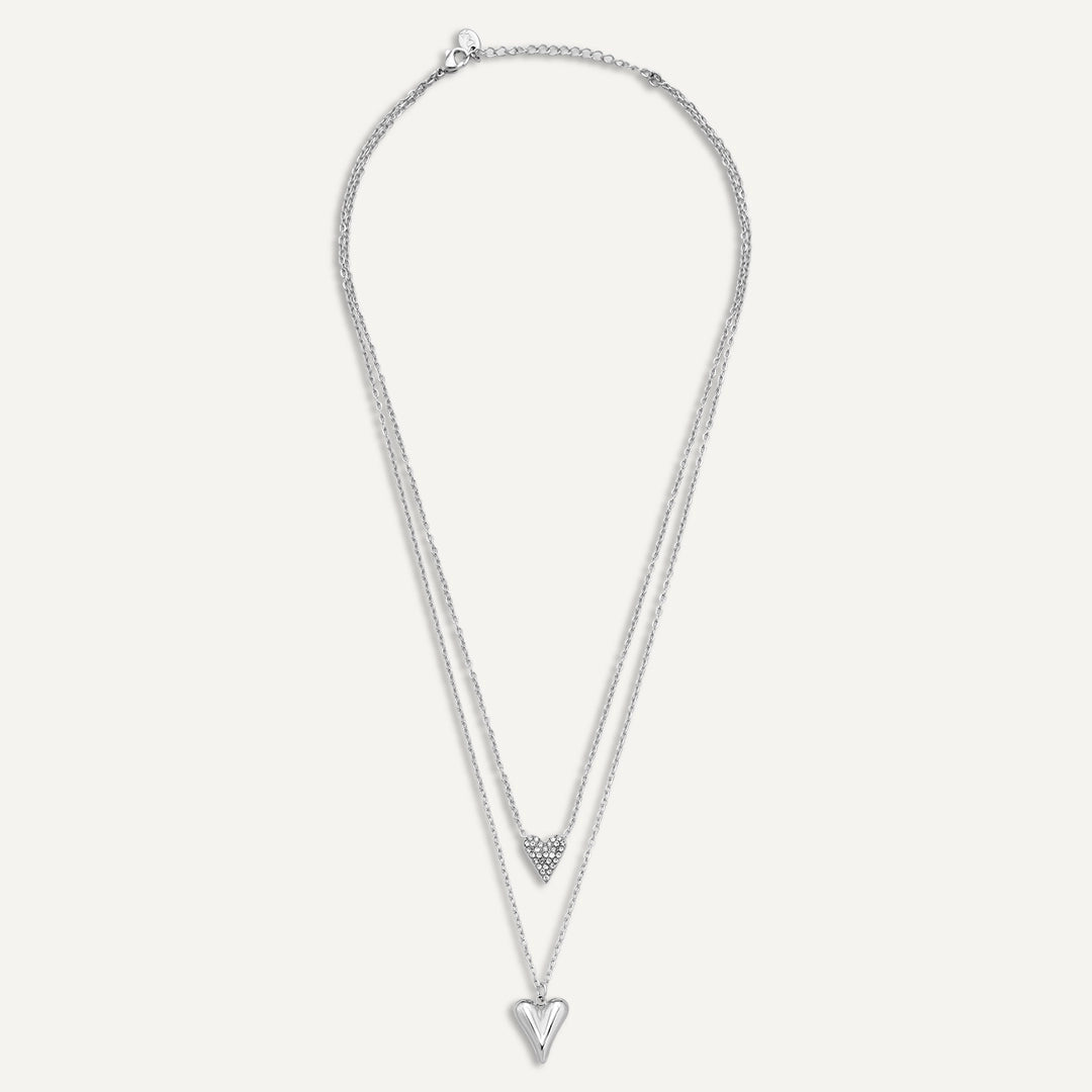 This stunning piece features two delicate chains, each adorned with a heart pendant—one smooth and polished, the other embellished with shimmering crystals. Crafted from white gold-plated stainless steel, this necklace offers a sophisticated, layered look that is both waterproof and tarnish-free. Perfect for adding a romantic touch to any outfit, this necklace is a versatile accessory for both casual and elegant occasions.