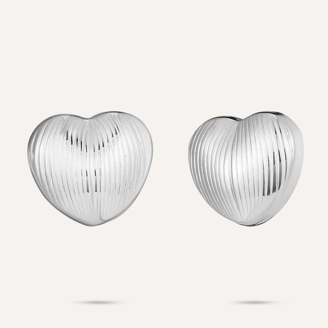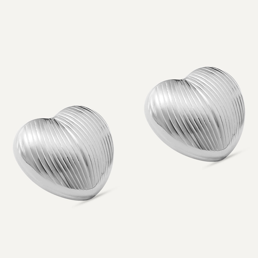 Big heart energy. These white gold-plated textured heart studs are bold, flirty, and unapologetically fun. With their grooved surface and glossy finish, they bring that retro-cool vibe to your ear stack. Perfect for solo styling or mixing with huggies and cuffs, these studs serve serious charm from brunch to night out.
