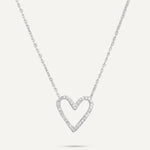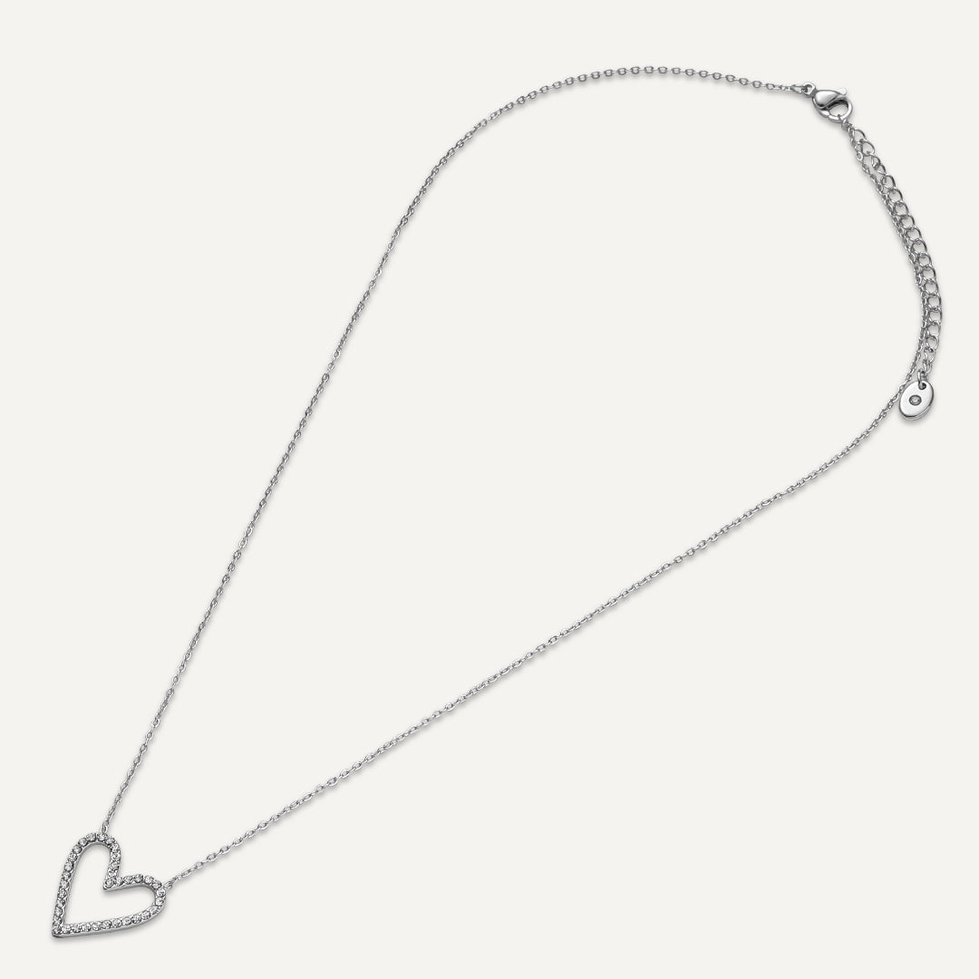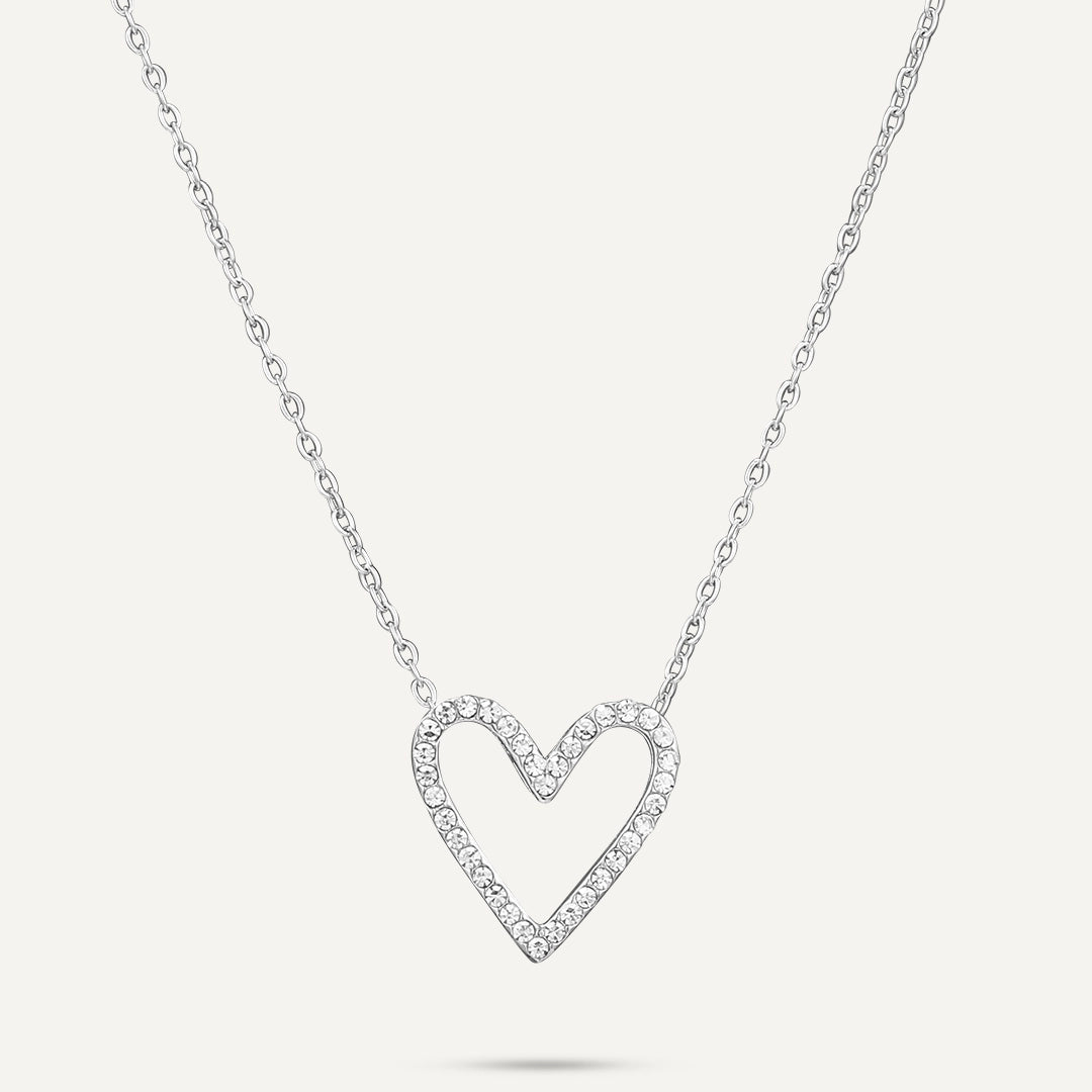 This necklace features an open heart-shaped pendant, adorned with radiant crystals that shine with every movement. Crafted from white gold-plated stainless steel, it is durable, water-proof, and tarnish-free.