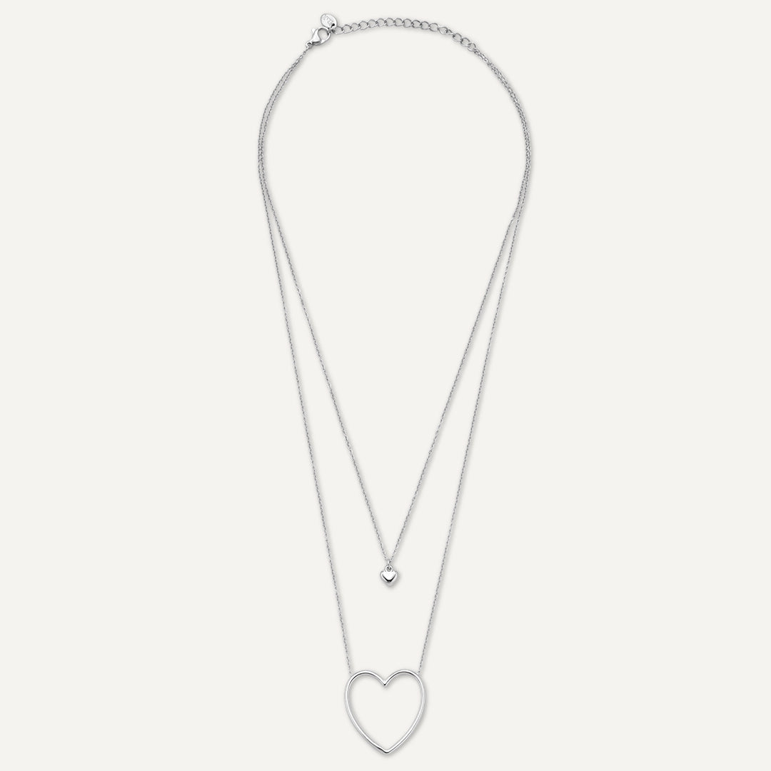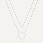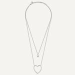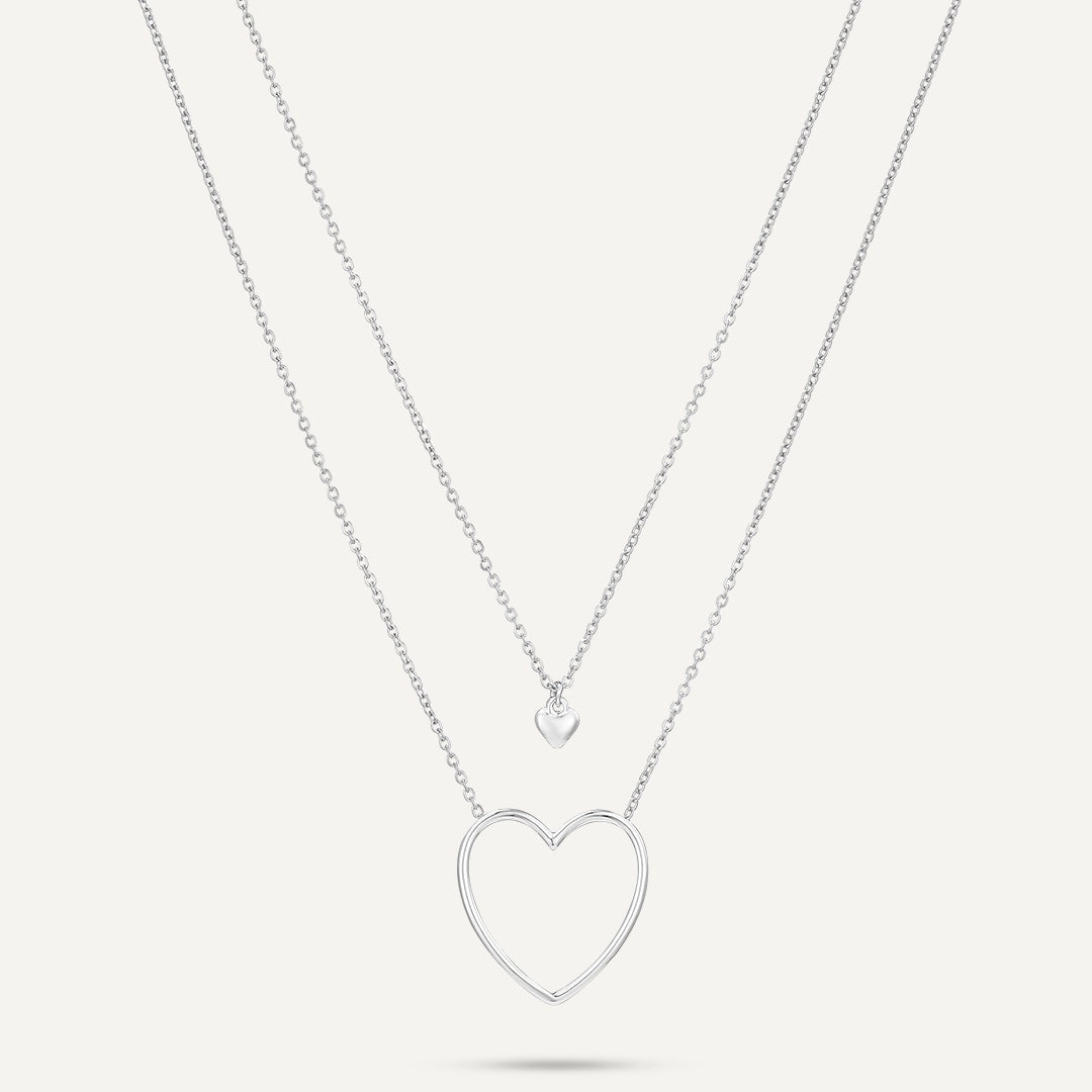 This charming piece features a dual-layered design with two delicate white gold-plated chains, each adorned with a heart charm—one solid and one open. The layered look adds depth and dimension, making this necklace a versatile piece that complements any outfit.