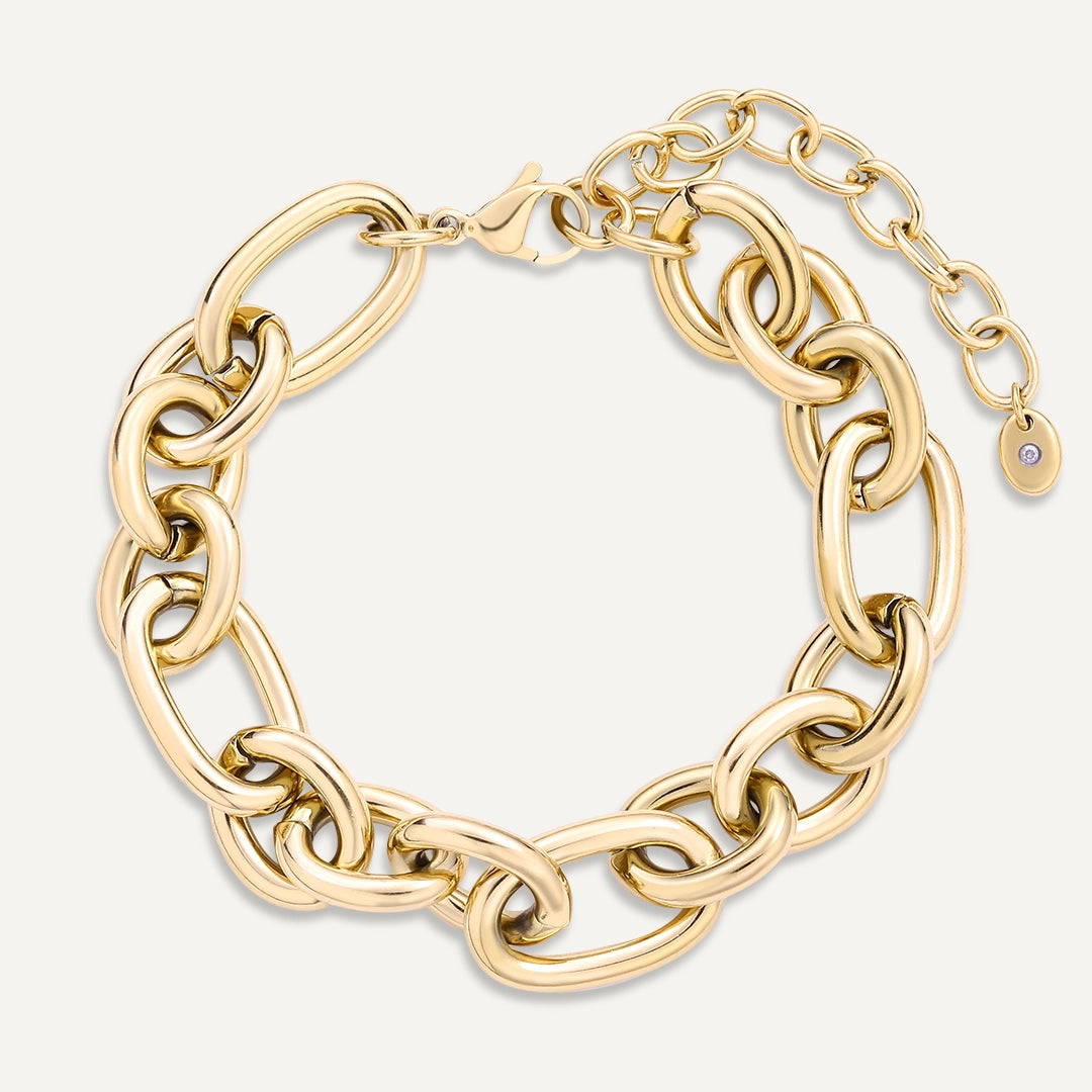 Bold, fearless and full of vibe – this chunky chain bracelet is your golden ticket to statement layering. Featuring oversized interlocking links with a high-shine finish, it's the ultimate power piece that instantly levels up your wrist game. Whether stacked with your everyday favourites or worn solo for impact, this bracelet brings unapologetic confidence to every outfit.