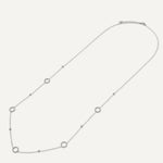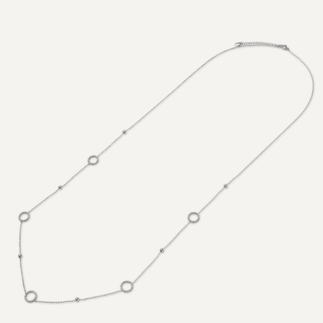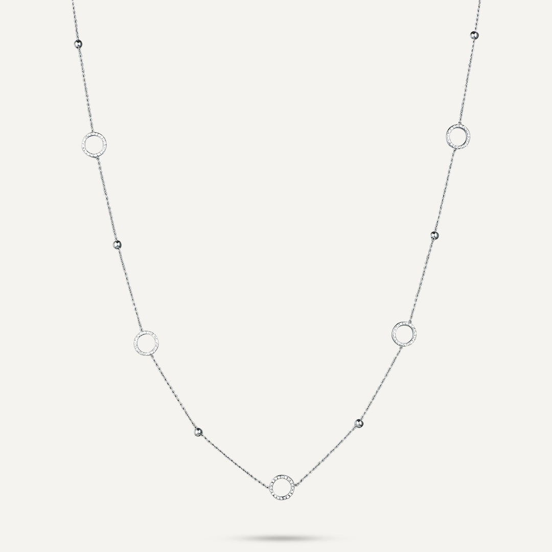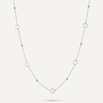 This exquisite piece features a series of dainty circles embellished with sparkling cubic zirconia, spaced along a white gold-plated chain. Its elongated design makes it perfect for layering with shorter necklaces, creating a versatile and chic look that transitions seamlessly from day to night.
