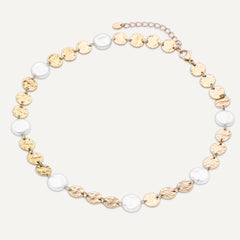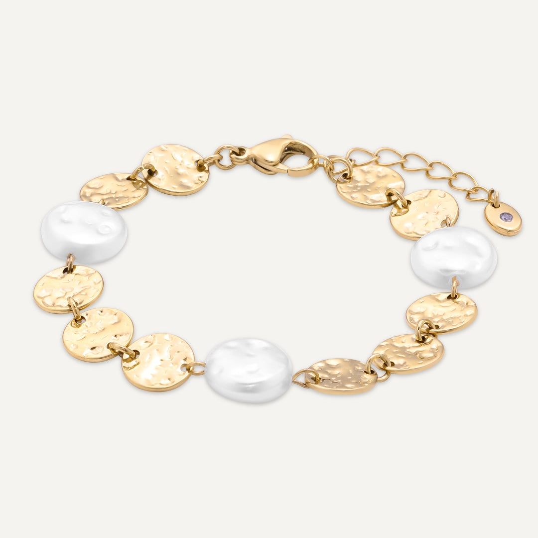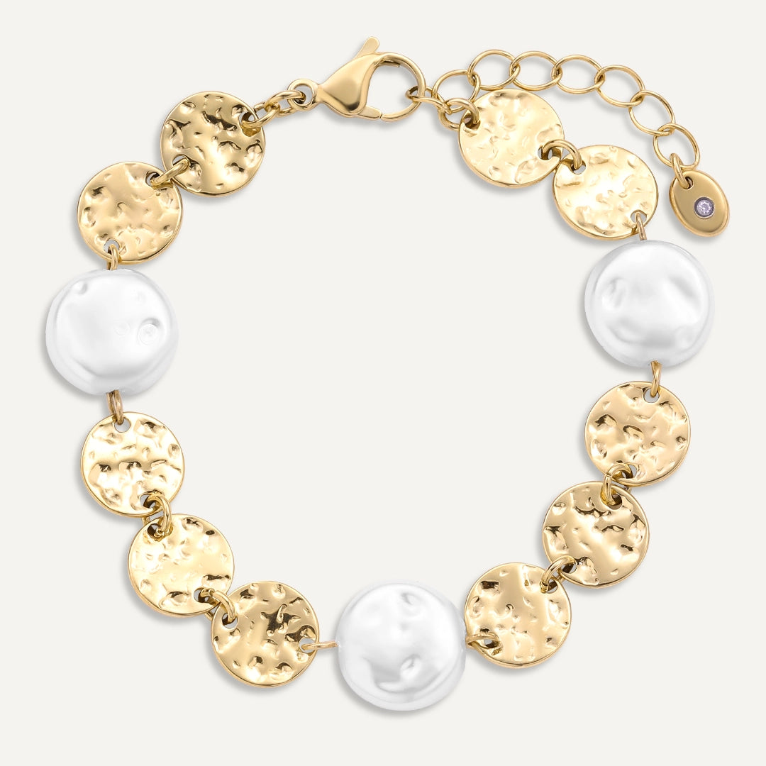 Inspired by the glow of the moon and the beauty of contrast, the Vibes Lunar Textures Pearl Bracelet combines hammered gold discs with smooth pearl-effect accents. The interplay of texture and shine creates a bold, modern look that’s as statement-making as it is versatile. Crafted in 18K gold-plated stainless steel, this piece is water-proof, tarnish-free, and finished with an adjustable clasp for effortless wear.
