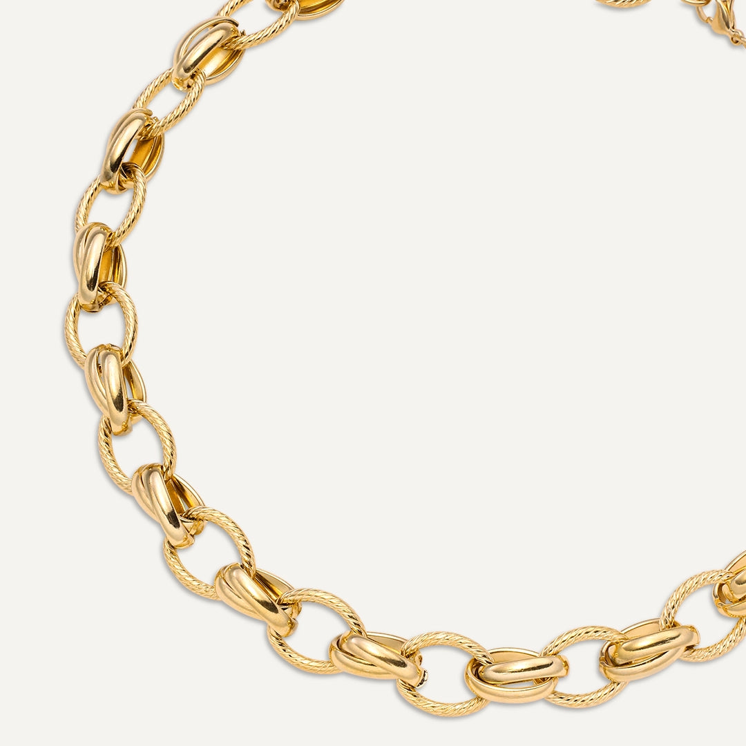 Make a bold entrance with the Luxe Loop Necklace – where sleek gold plating meets high-impact style. Featuring alternating smooth and textured oval links, this statement piece is perfect for stacking or standing out solo.