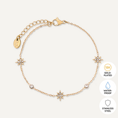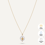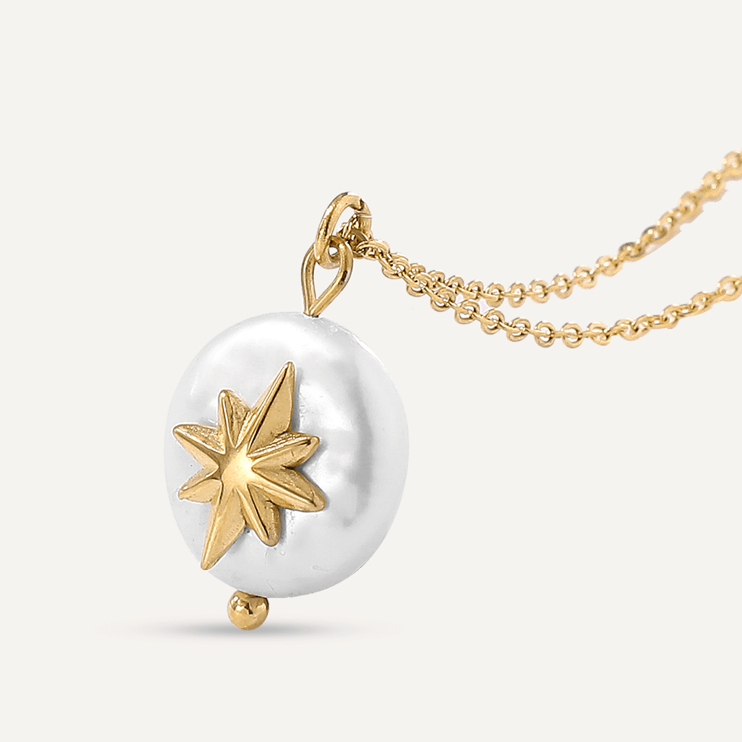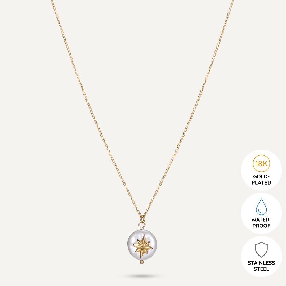 This elegant necklace features a lustrous pearl adorned with a gold-plated star emblem, symbolizing direction and inspiration. Crafted from 18K gold-plated stainless steel, the necklace exudes a sense of timeless beauty.