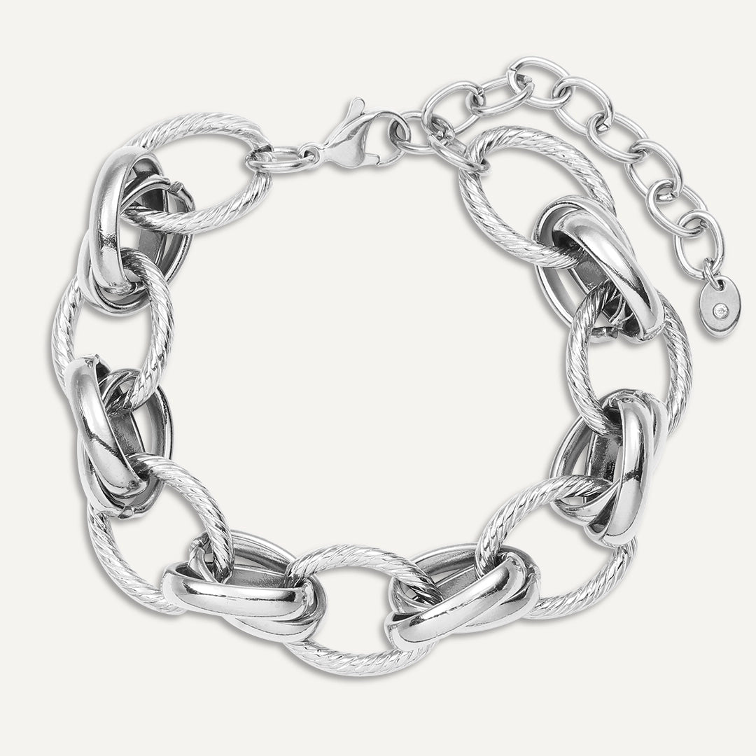 Chunky. Confident. Unapologetically bold. The Vibes Power Link Chain Bracelet features oversized oval links in a mix of smooth and rope-textured finishes, all drenched in gleaming white gold plating. Designed to make a statement, this bracelet is fitted with a secure lobster clasp and extender for the perfect fit.