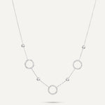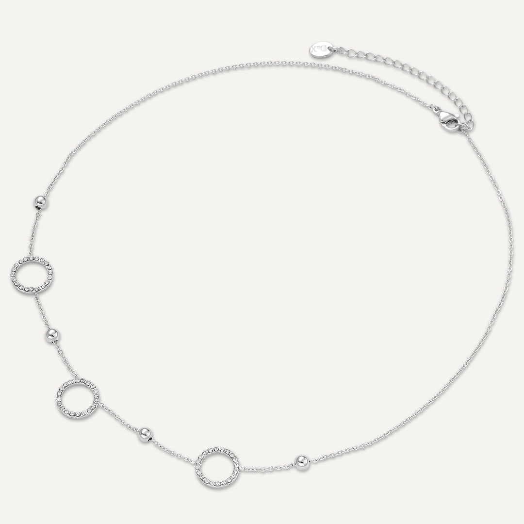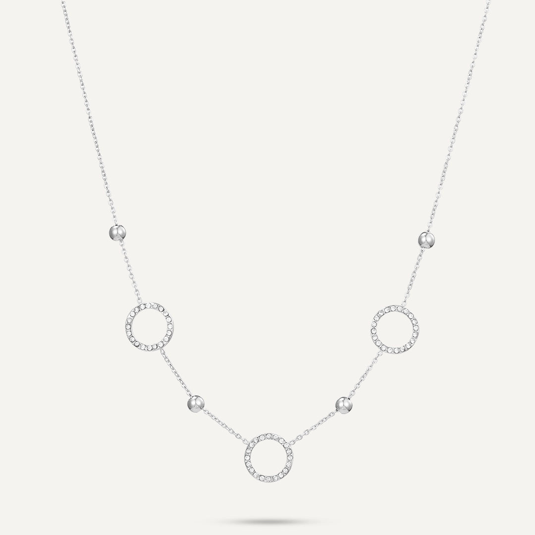 This necklace features a delicate chain adorned with crystal-studded circles and polished white gold beads, creating a harmonious balance between shimmer and simplicity. Crafted from white gold-plated stainless steel, it's perfect for layering with other necklaces or wearing solo for a minimalist look.