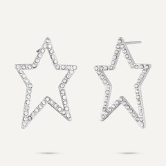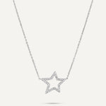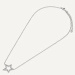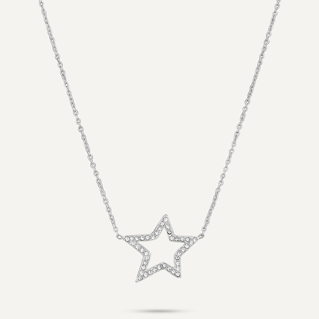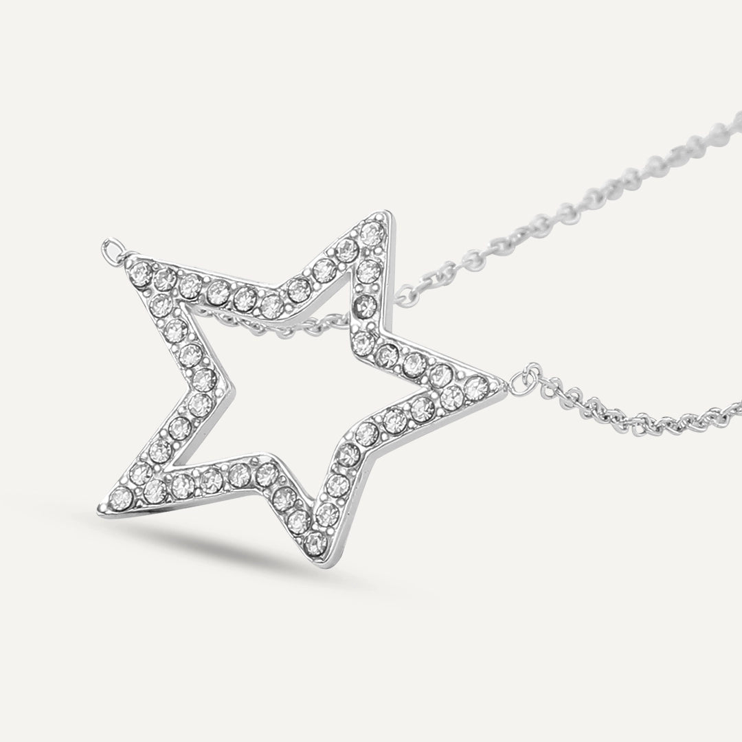 This necklace features a bold star-shaped pendant, outlined with shimmering crystals that capture the brilliance of the night sky. Crafted from white gold-plated stainless steel, it is both durable and stylish, offering a water-proof and tarnish-free finish.