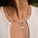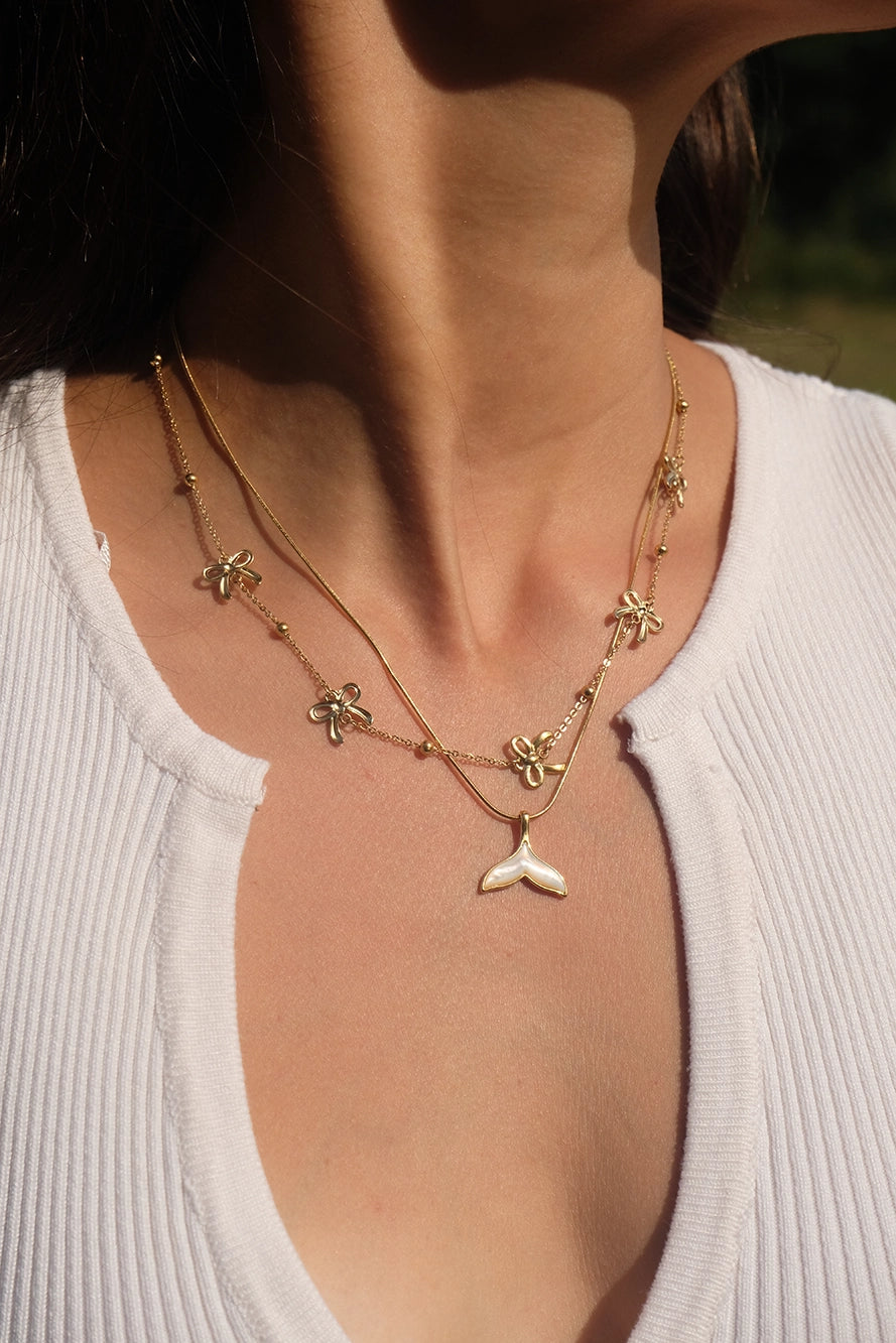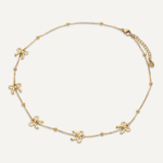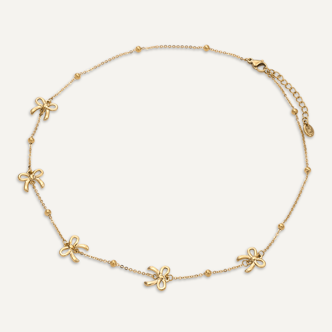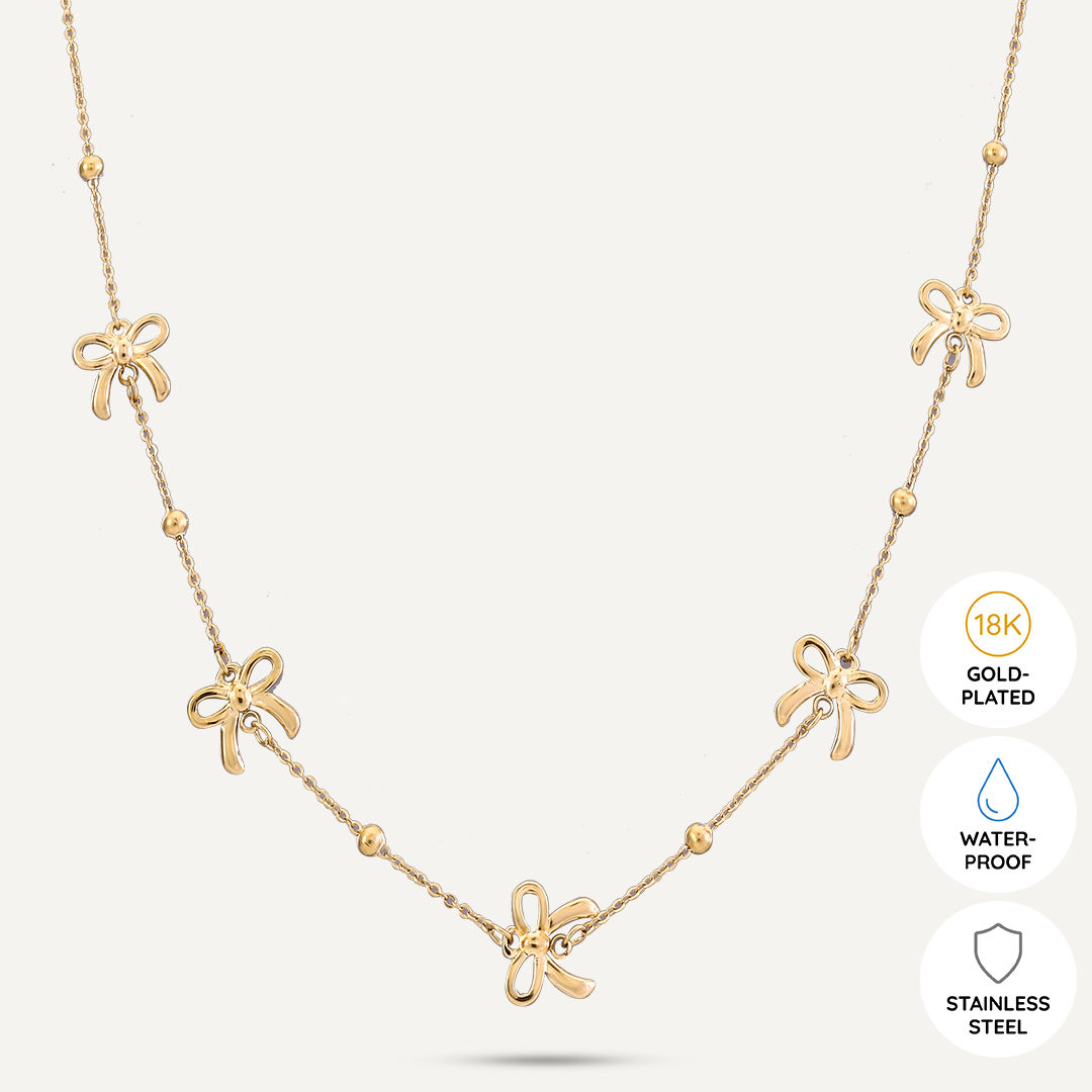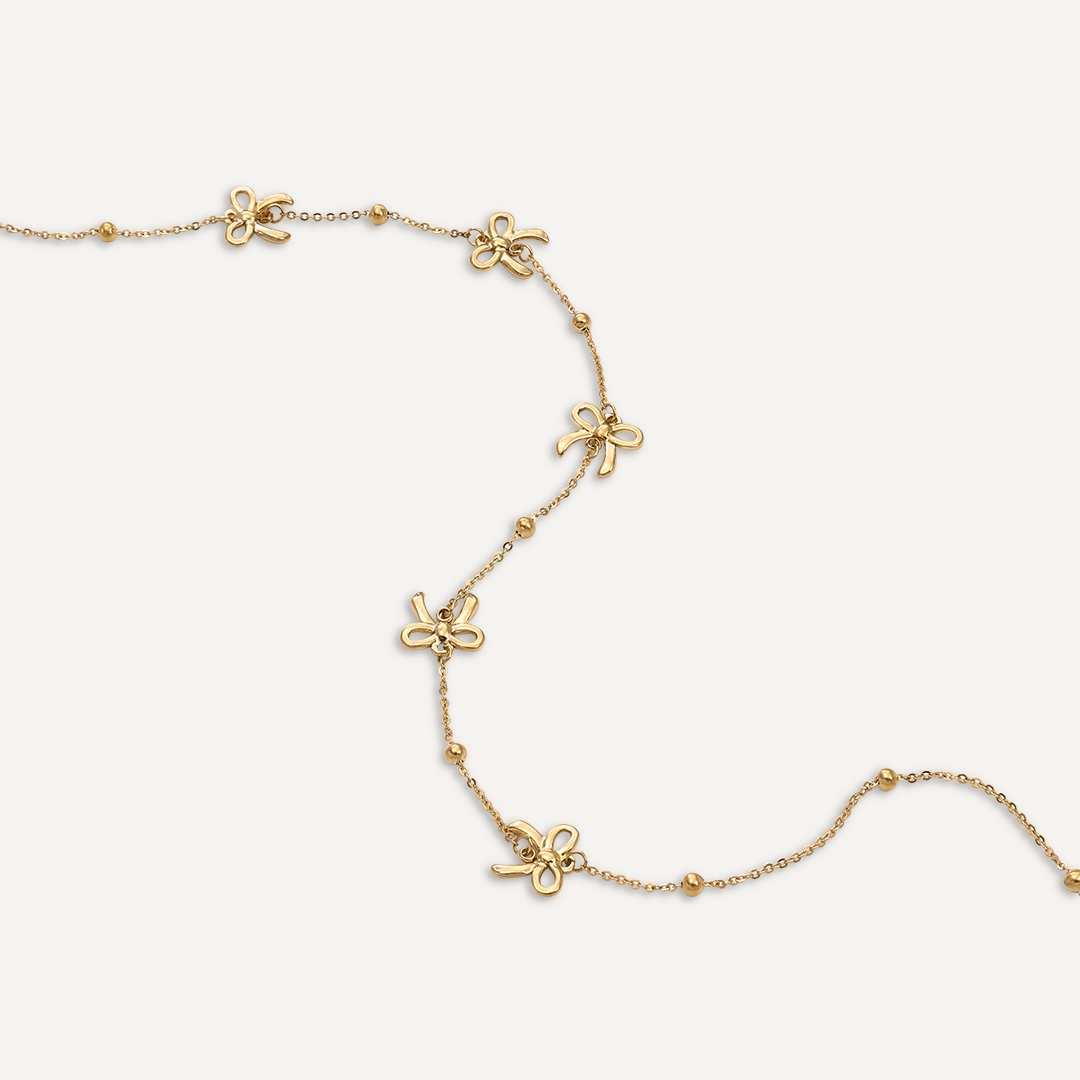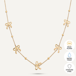 This charming necklace features delicate bow pendants interspersed along a fine gold chain, creating a look that is both whimsical and sophisticated. Crafted from 18K gold-plated stainless steel, this necklace is designed to be durable, water-proof, and tarnish-free.