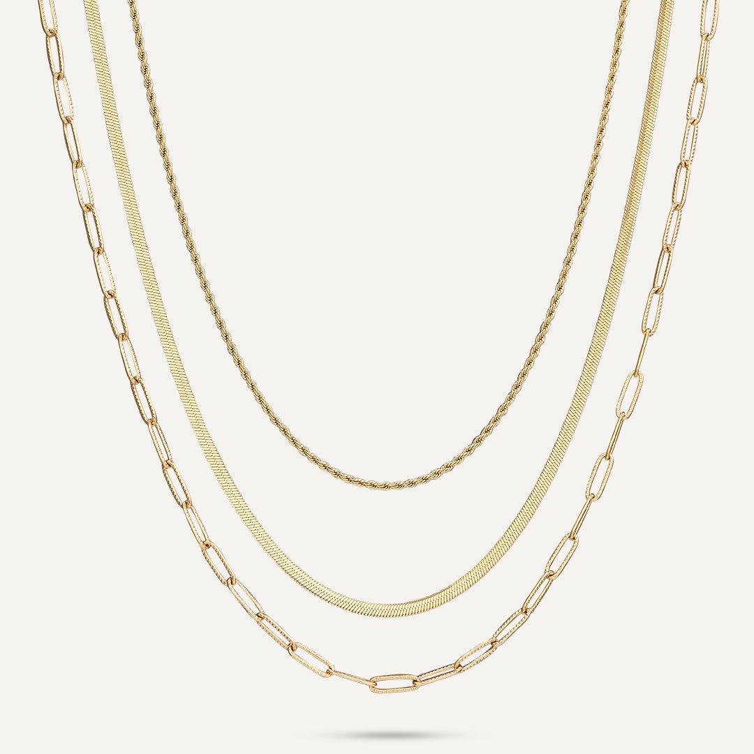 Master the art of effortless layering with the Triple Threat Layers Necklace — a 3-in-1 gold-plated dream made for stacking queens. Featuring a trio of textures from rope to snake to paperclip, this pre-styled statement saves you time while turning every outfit into a vibe. Crafted in 18K gold-plated stainless steel, it’s waterproof, tarnish-resistant, and guaranteed to shine from coffee runs to night outs.