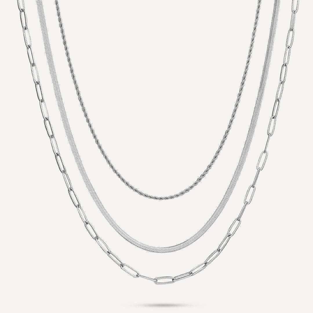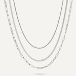 Master the art of effortless layering with the Triple Threat Layers Necklace — a 3-in-1 white gold-plated dream made for stacking queens. Featuring a trio of textures from rope to snake to paperclip, this pre-styled statement saves you time while turning every outfit into a vibe. Crafted in white gold-plated stainless steel, it’s waterproof, tarnish-resistant, and guaranteed to shine from coffee runs to night outs.